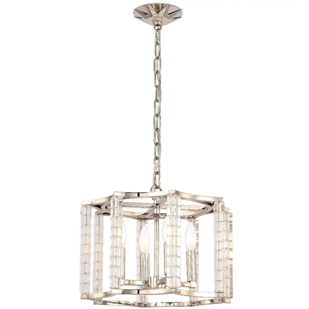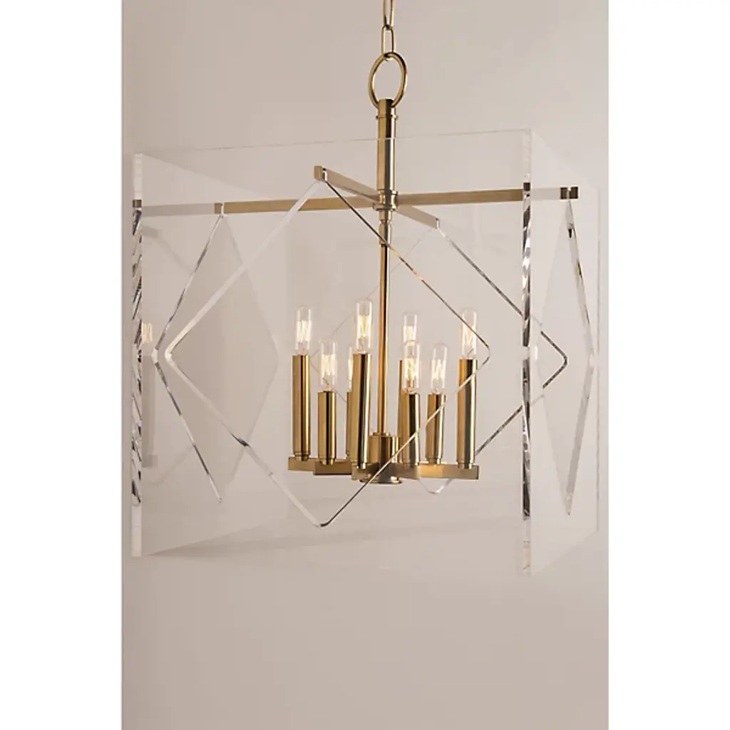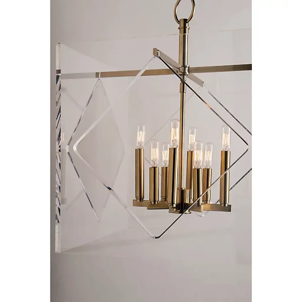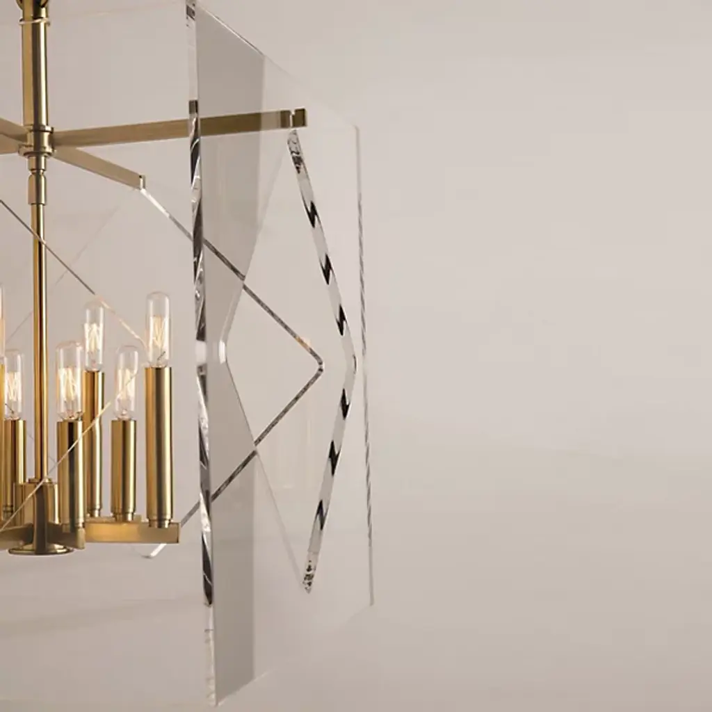A star is born: The Hudson Valley Lighting Travis Pendant is inspired by the luxe Hollywood Regency style that ruled Tinseltown’s golden age. It features an elegantly (and cinematically) proportioned chandelier, which appears to float within a polished Acrylic Glass cube. Cutout diamond shapes heighten the interplay between reflective surfaces and refracted light. Includes a 54-inch field-adjustable chain.