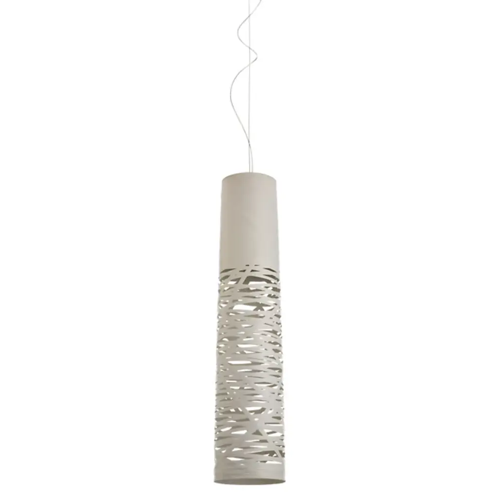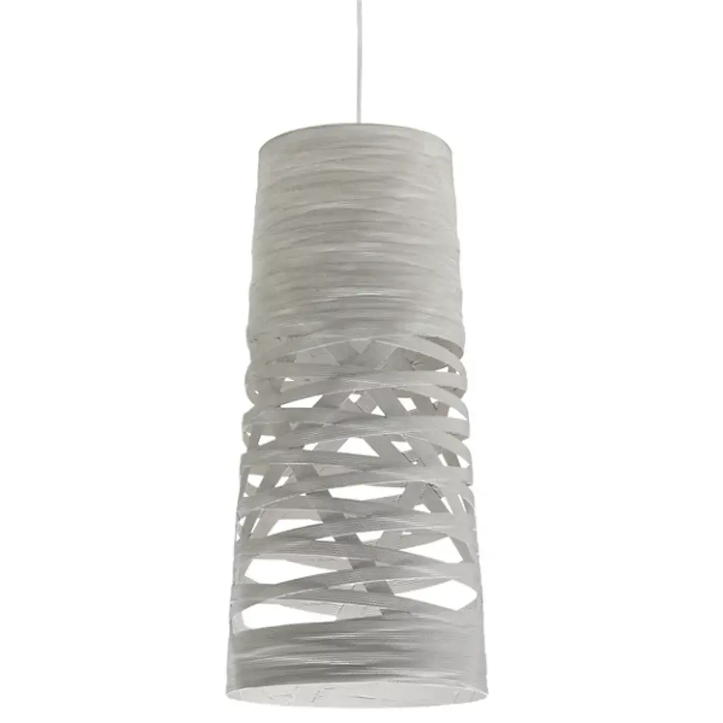 The seduction of a woman's tresses inspired the intricately interwoven form of the Foscarini Tress Mini Pendant. Strips of lacquered fiberglass are woven and then coated in resin to maintain the finished shade's distinctive shape and intriguing play of light. Available in three colors. Designed by Marc Sadler.