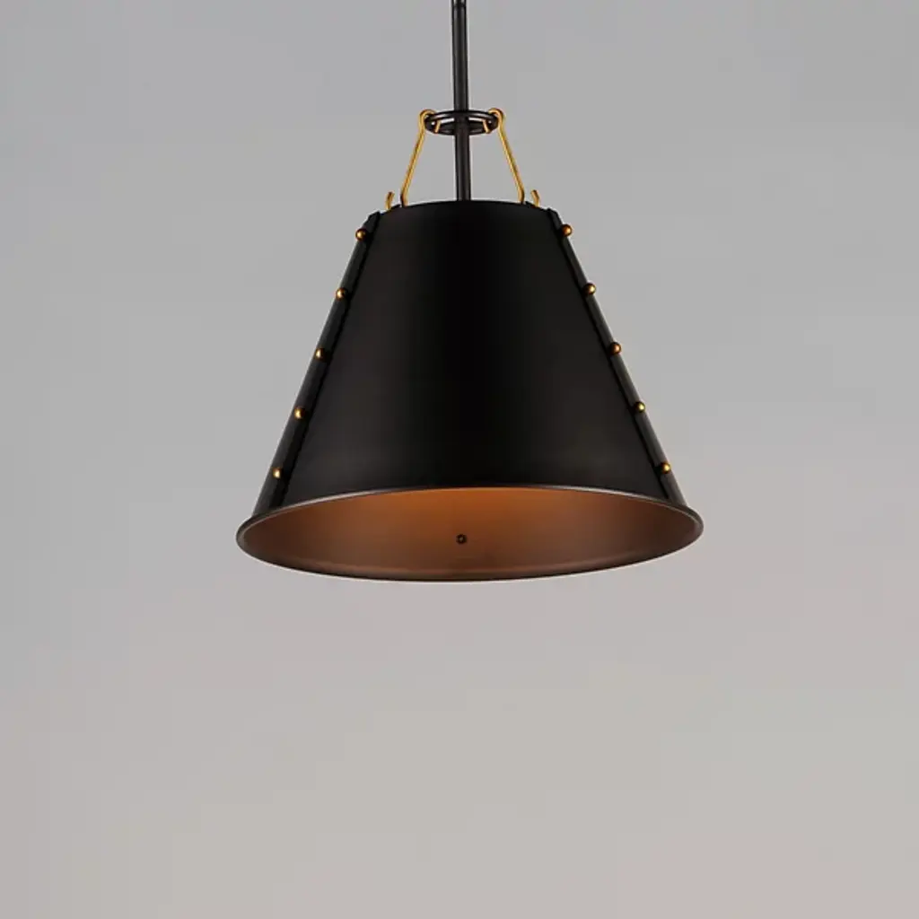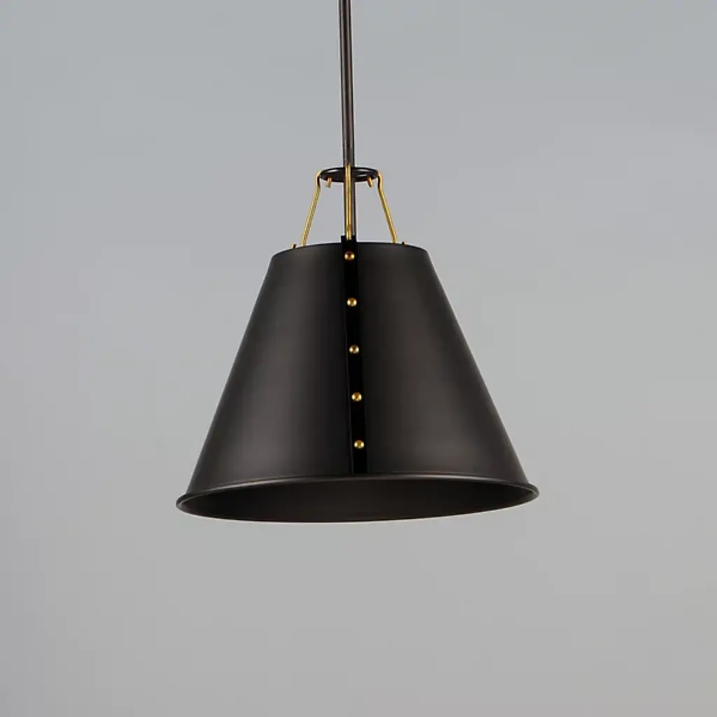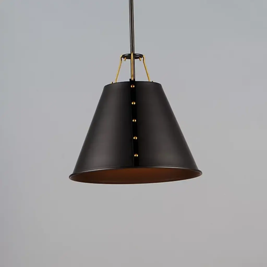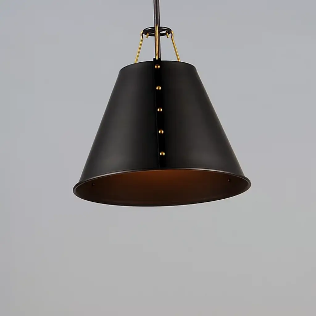 Riveting style achieved with meticulous craftsmanship. Satisfy your eye for detail with the layered design of the Trestle Small Pendant from Maxim Lighting. This singular piece is ideal for an intimate setting or communal area. It presents a clean geometric silhouette the contemporary home can appreciate. The shade is metal spun by skilled craftsmen. Artisans adorn the shade with eye-catching rivets on the sides and charming hooks on top. With openings on either end, the shade pushes out an ambient and task light underlined by its comfortable diffused quality.