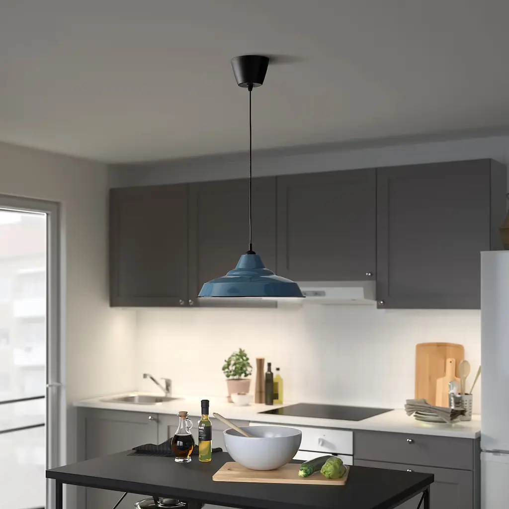 TRETTIOEN Pendant lamp - blue 15 ". The lamp spreads a good, directed light and is great to hang over your dining table or kitchen island. Light bulb sold separately. IKEA recommends LED bulb E26 globe opal white. To be hung on a ceiling hook. Ceiling hook not included.