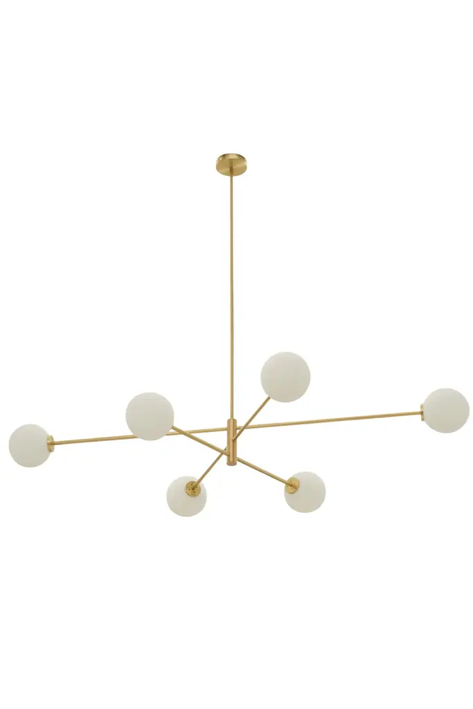 Trevi six pendant by CTO LightingMaterials: satin brass with matt opal glass shadesAlso available in dark bronze with matt opal glass shadesDimensions: H 25 x W 154 cm All our lamps can be wired according to each country. If sold to the USA it will be wired for the USA for instance.Other sizes available6 x E12, 25w max (or 4.5w LED 2700k)weight 10kg (22lbs)supplied with 1000mm (39.4”) drop rod as standard (adjustable on site)additional drop rod at $190 per 1000mmfor installation a minimum drop rod of 50mm is required, maximum 3000mm (118”)no bulbs suppliedmounts onto 4” junction boxFounded in 1998 by Chris and Clare Turner, CTO Lighting launched their first collection on the guiding principles of designing lights of uncompromising quality, using only the finest materials and working with elite British craftsmen. This collection of lighting symbolised elegance and the excellence of British design and manufacturing; the benchmark for all future collections.