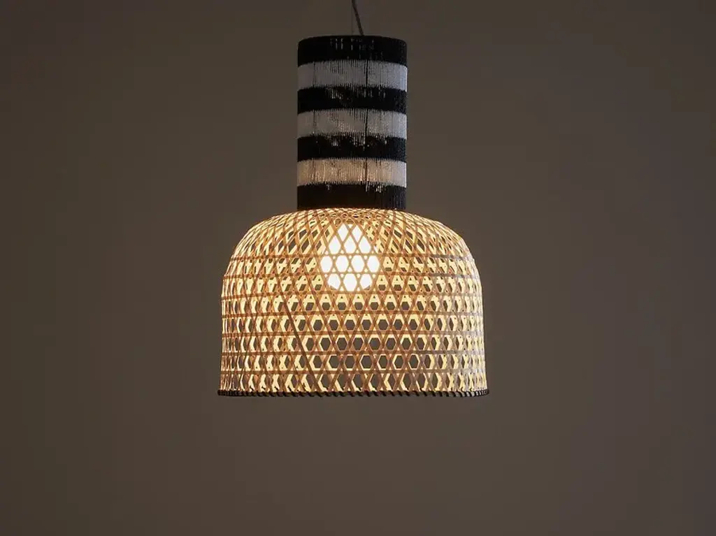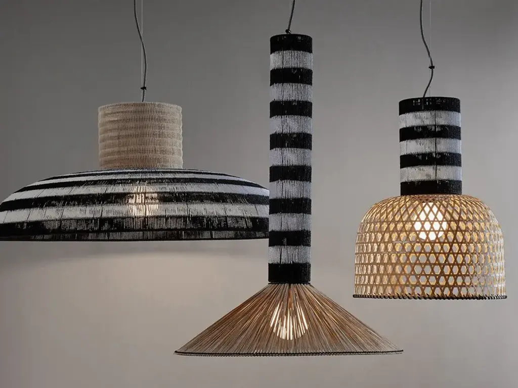 An original tribe of three lamps with bold, funky accents. Woven baskets of different sizes are stacked to form unique creations, with lampshades in rattan or natural bamboo or black and white paper cord. Play with shapes and heights: use alone or in groups. The TRIBE pendant lamp is part of the ‘Nomad Escape’ collection designed by Otto, an agency founded by architect and designer Paola Navone. Directed by Cristina Pettenuzzo and Domenico Diego, this collection with a bold and unique identity transforms the home into an oasis of well-being for all seasons.Features:Hand-woven black and white paper rope lampshadeHand-woven natural rattan tube hatBlack and white textile sheathed electrical cableHolder for E27 lamp holderFor bulb (not included) LED max. 10W