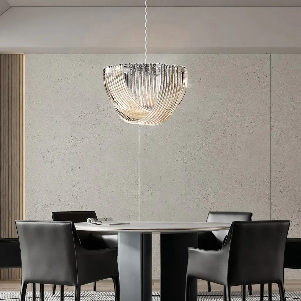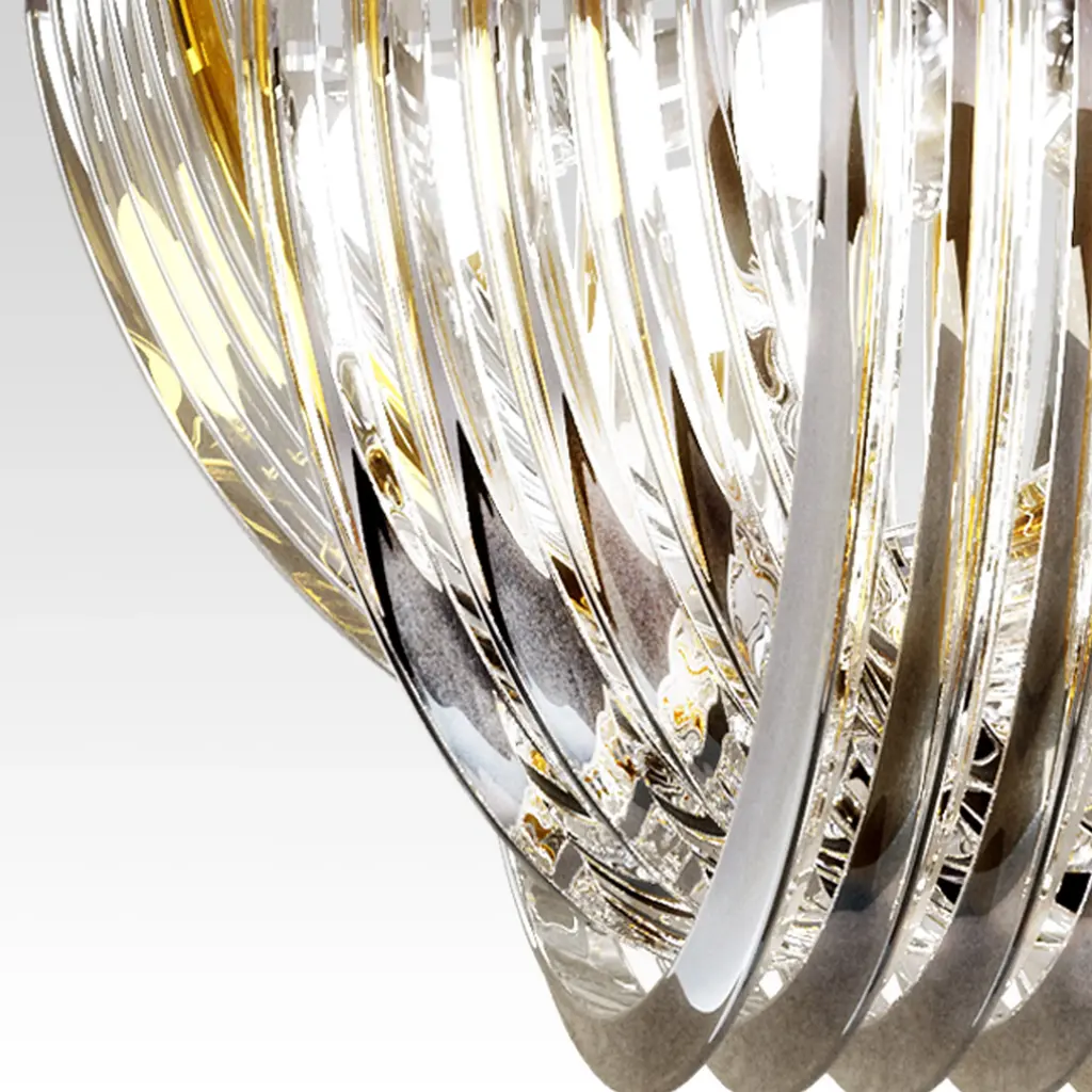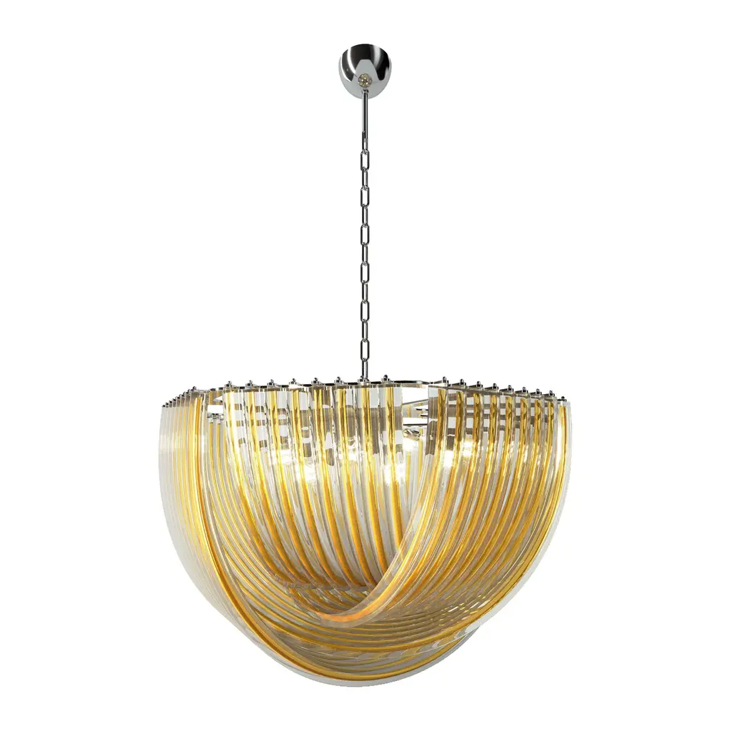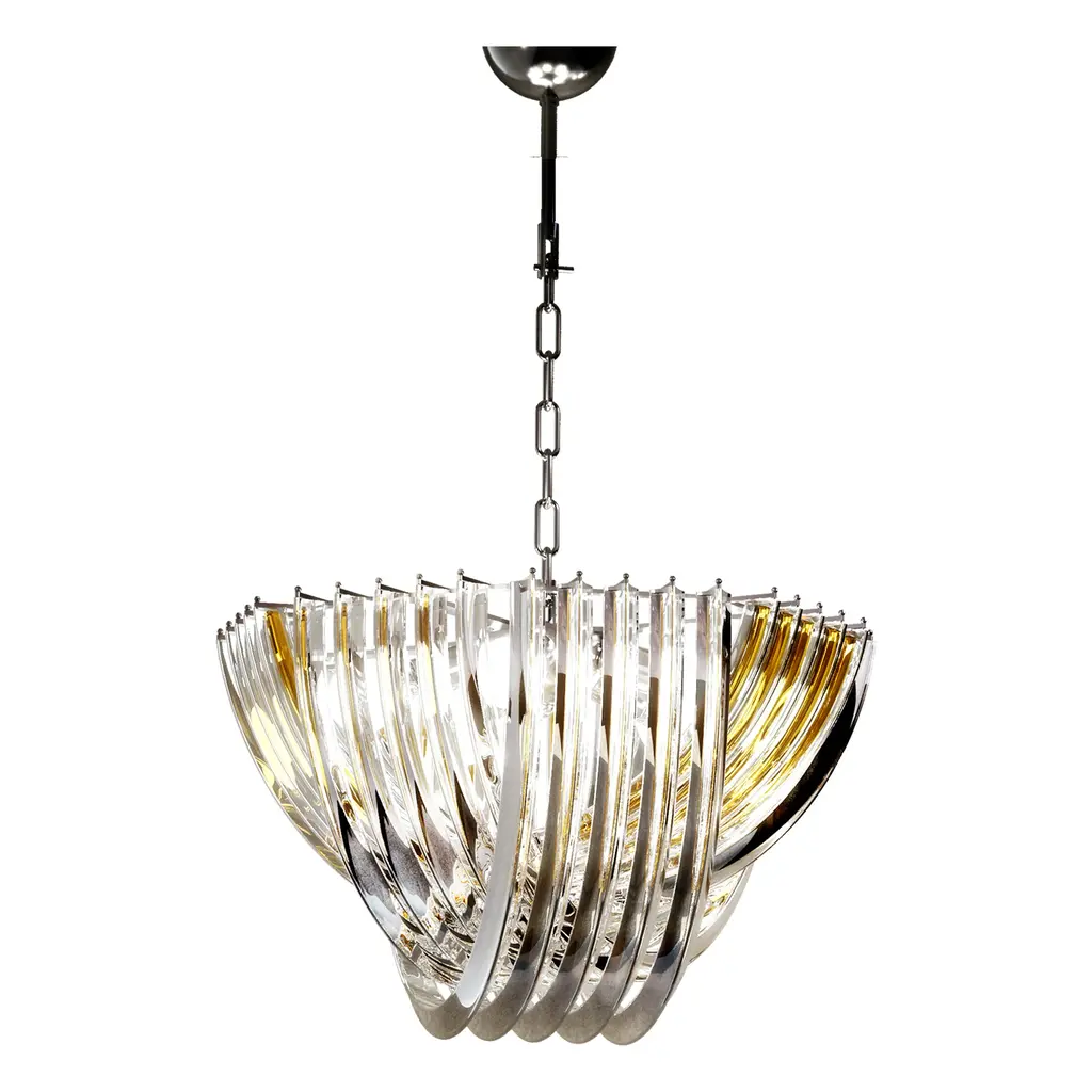 Elevate any space with the timeless elegance of the Triedri Pendant Light from Venini. Crafted from solid crystal glass elements, each triangular prism reflects light in captivating directions, creating a truly spectacular display. The unique shape and sleek chrome-plated metal structure exude art deco sophistication and luxury. Available in both clear and amber tones. Highlights