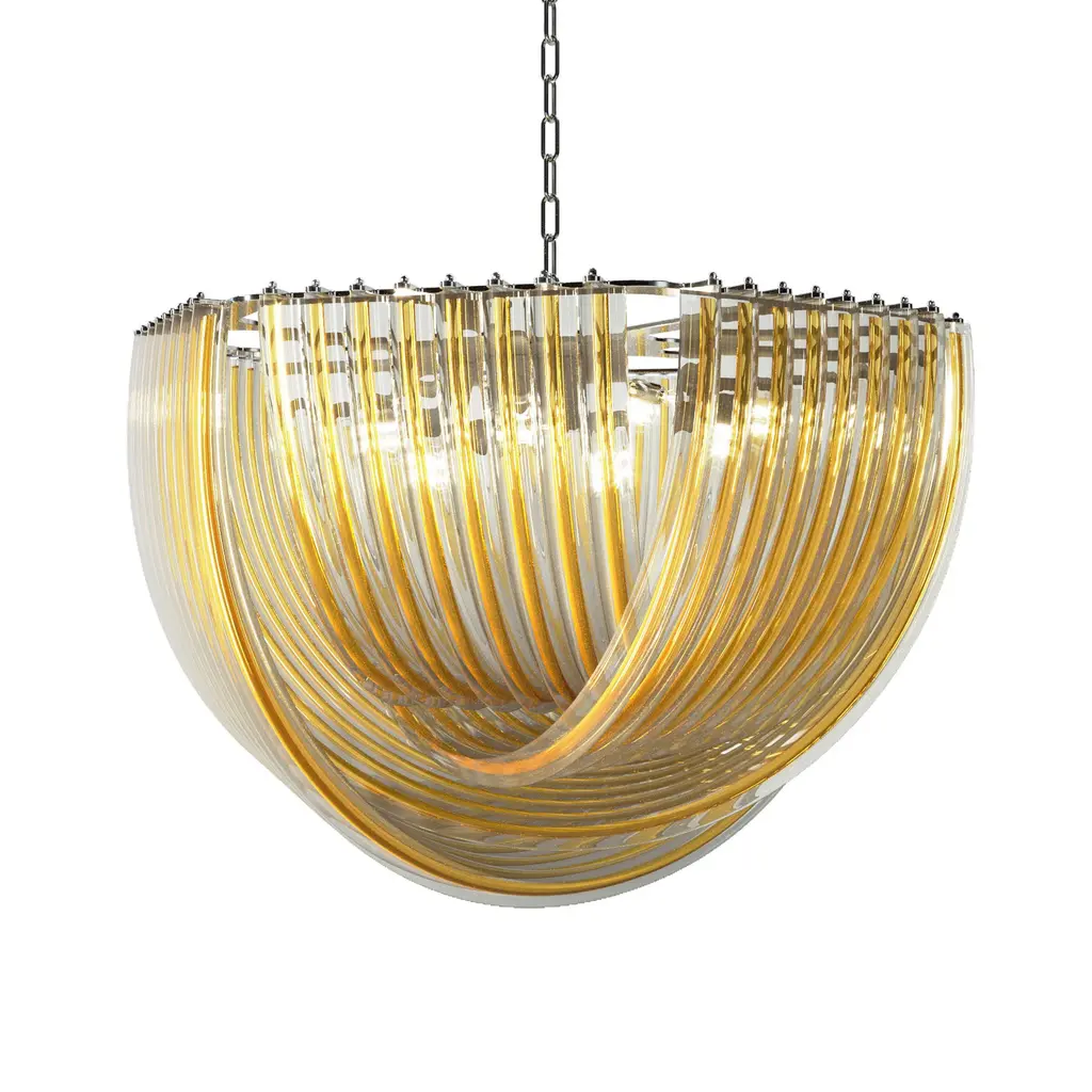 Elevate any space with the timeless elegance of the Triedri Pendant Light from Venini. Crafted from solid crystal glass elements, each triangular prism reflects light in captivating directions, creating a truly spectacular display. The unique shape and sleek chrome-plated metal structure exude art deco sophistication and luxury. Available in both clear and amber tones. Highlights