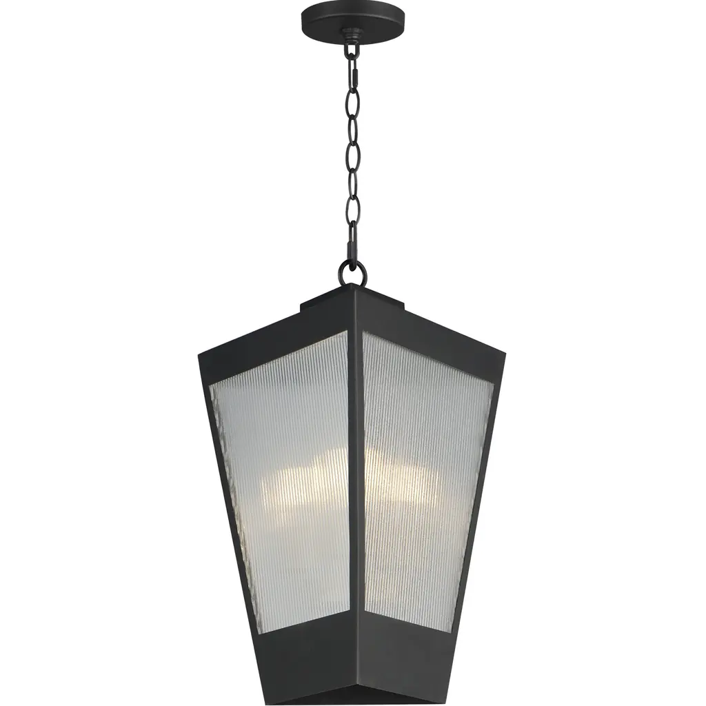 A transitional design suitable for both modern and more traditional applications, this outdoor series of lighting features Clear Ribbed glass that refracts the light source within triangular frames. A Black frame with warm Antique Brass light clusters within, the collection includes 3 sizes of wall sconces and 2 sizes of outdoor rated pendants. With a depth of less than 4 inches, this ADA compliant sconce may also be used in commercial applications.
