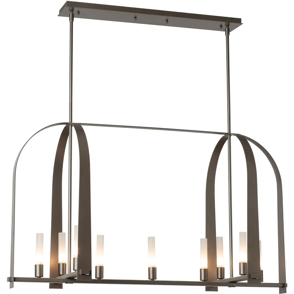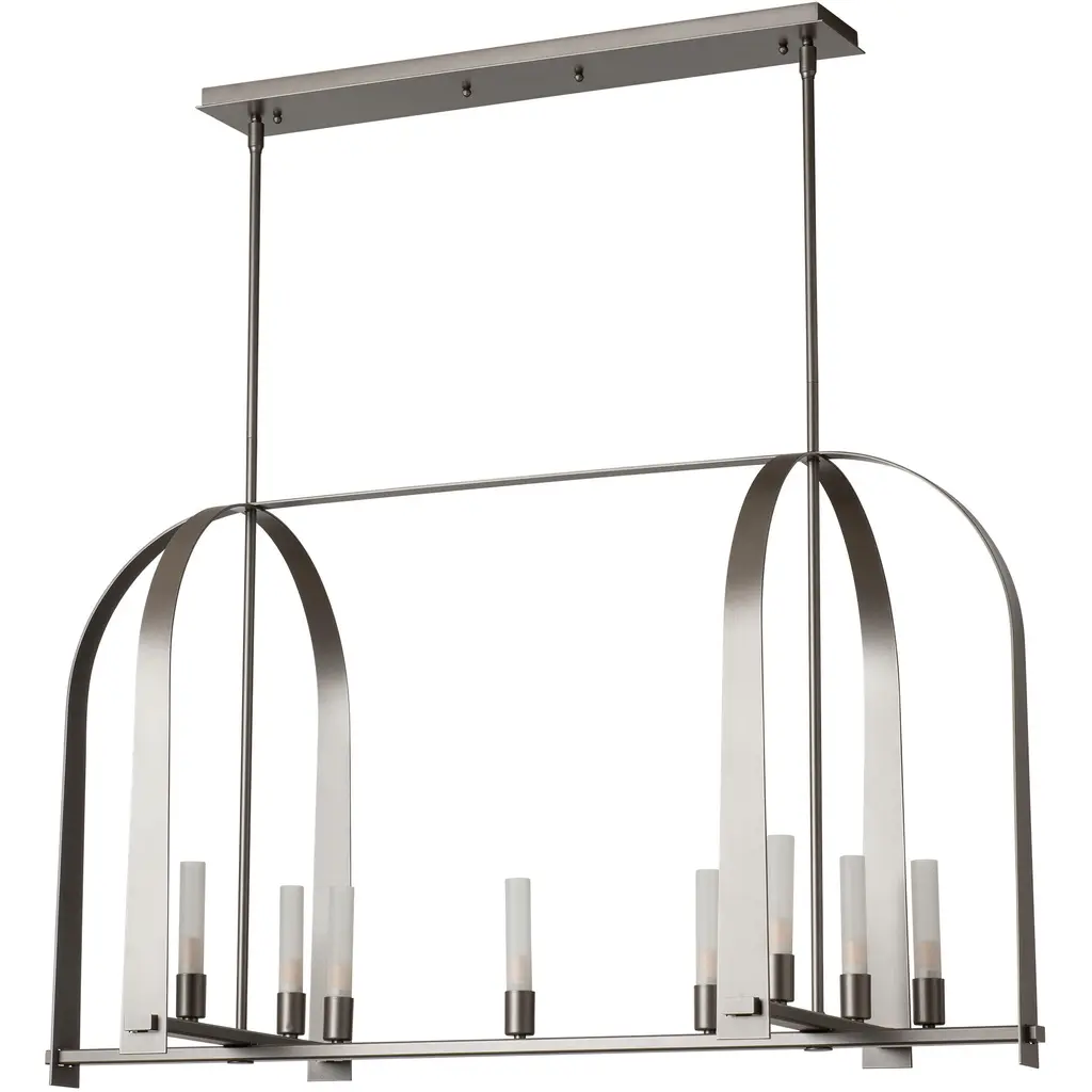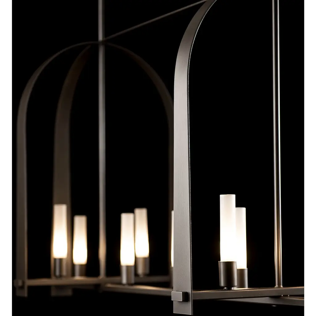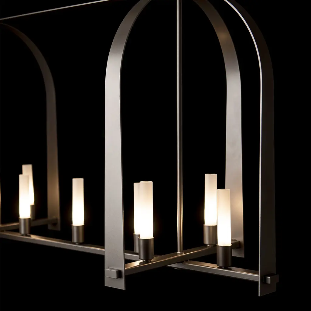 The Triomphe 9-Light Linear Pendant is a geometric, linear design features intersecting arches with a distinctive shape. The Triomphe takes its inspiration from traditional cage chandeliers, but with contemporary design touches that give it an open feel. Handcrafted of steel, it features two sets of intersecting arches, with frosted glass tubes fitted to the steel traverses with Craftsman tenon details. A Multi-Stem system provides great height adjustability.