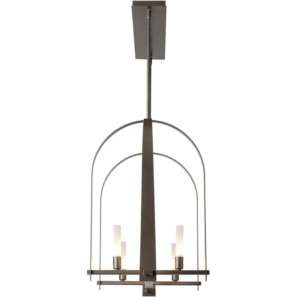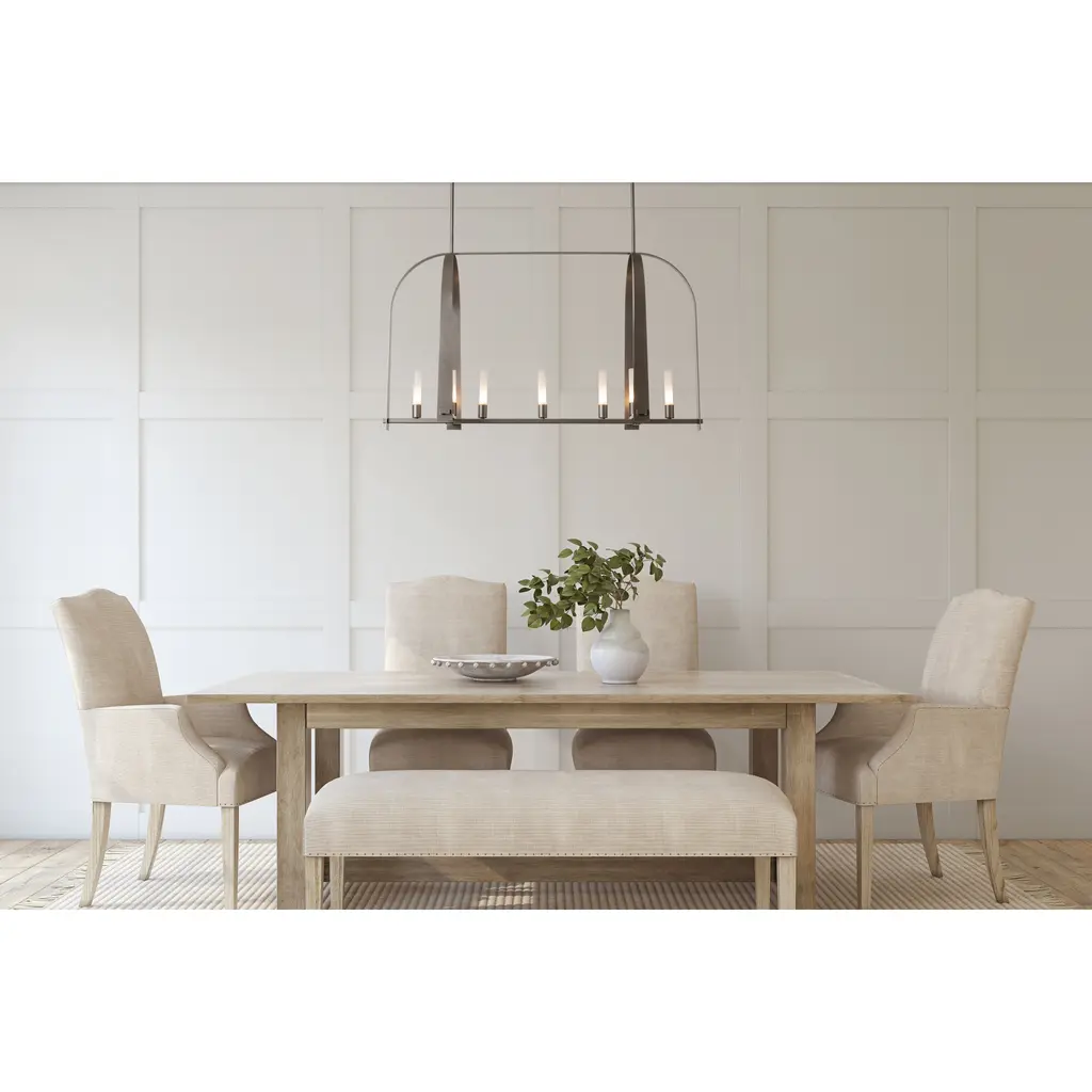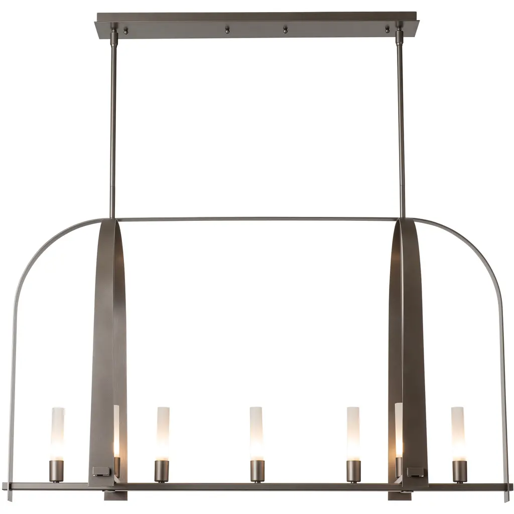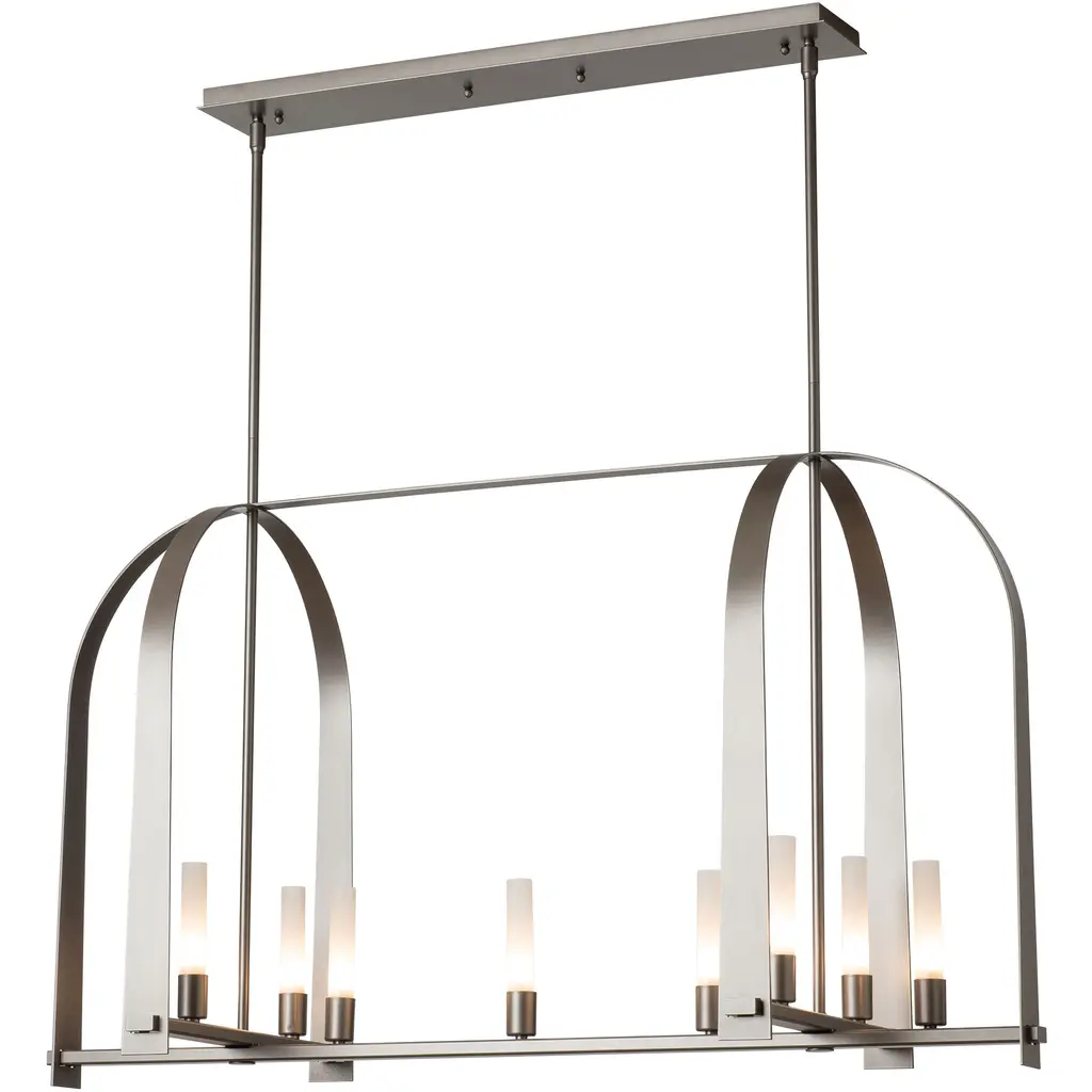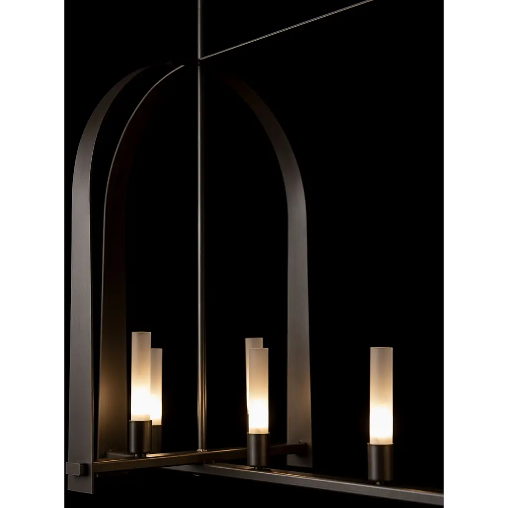 The Triomphe 9-Light Linear Pendant is a geometric, linear design features intersecting arches with a distinctive shape. The Triomphe takes its inspiration from traditional cage chandeliers, but with contemporary design touches that give it an open feel. Handcrafted of steel, it features two sets of intersecting arches, with frosted glass tubes fitted to the steel traverses with Craftsman tenon details. A Multi-Stem system provides great height adjustability.