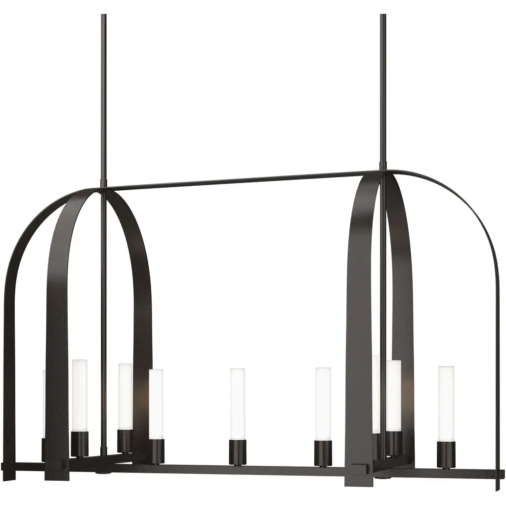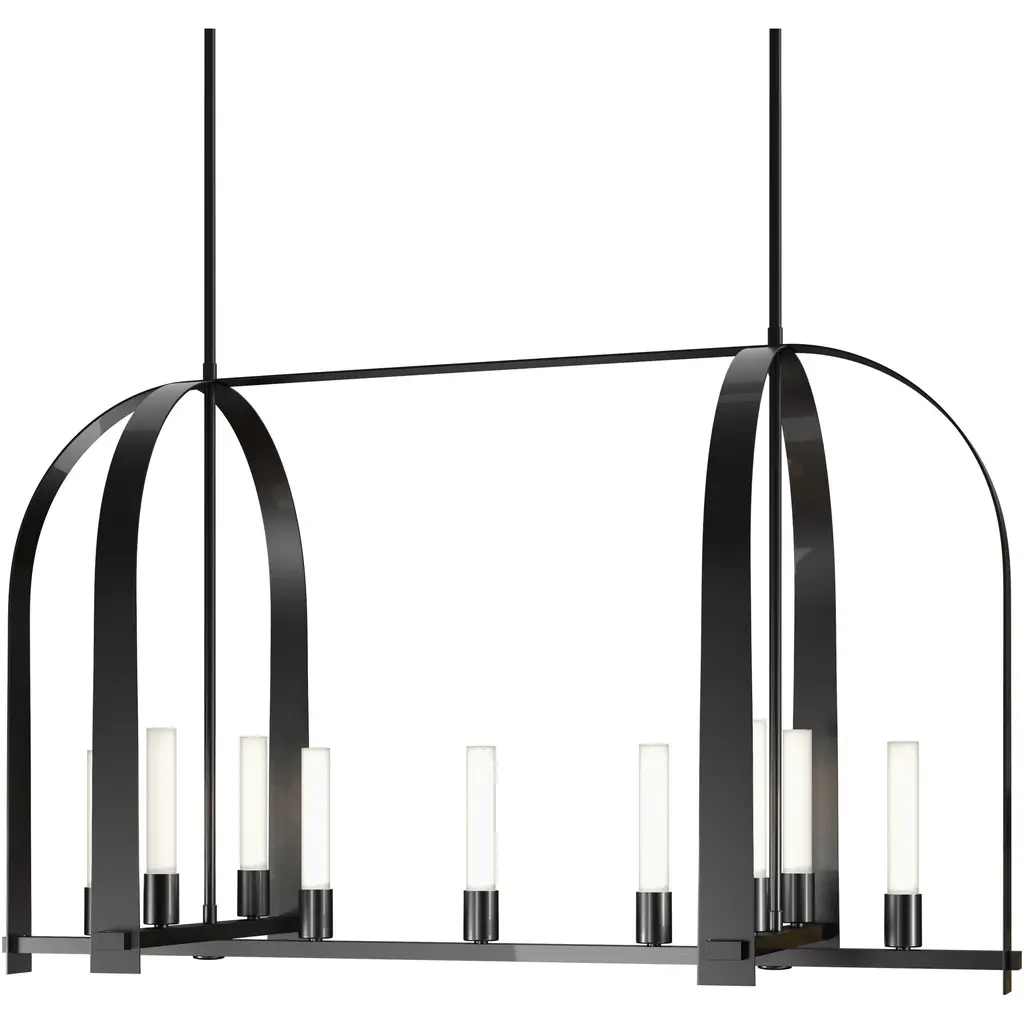 The Triomphe 9-Light Linear Pendant is a geometric, linear design features intersecting arches with a distinctive shape. The Triomphe takes its inspiration from traditional cage chandeliers, but with contemporary design touches that give it an open feel. Handcrafted of steel, it features two sets of intersecting arches, with frosted glass tubes fitted to the steel traverses with Craftsman tenon details. A Multi-Stem system provides great height adjustability.