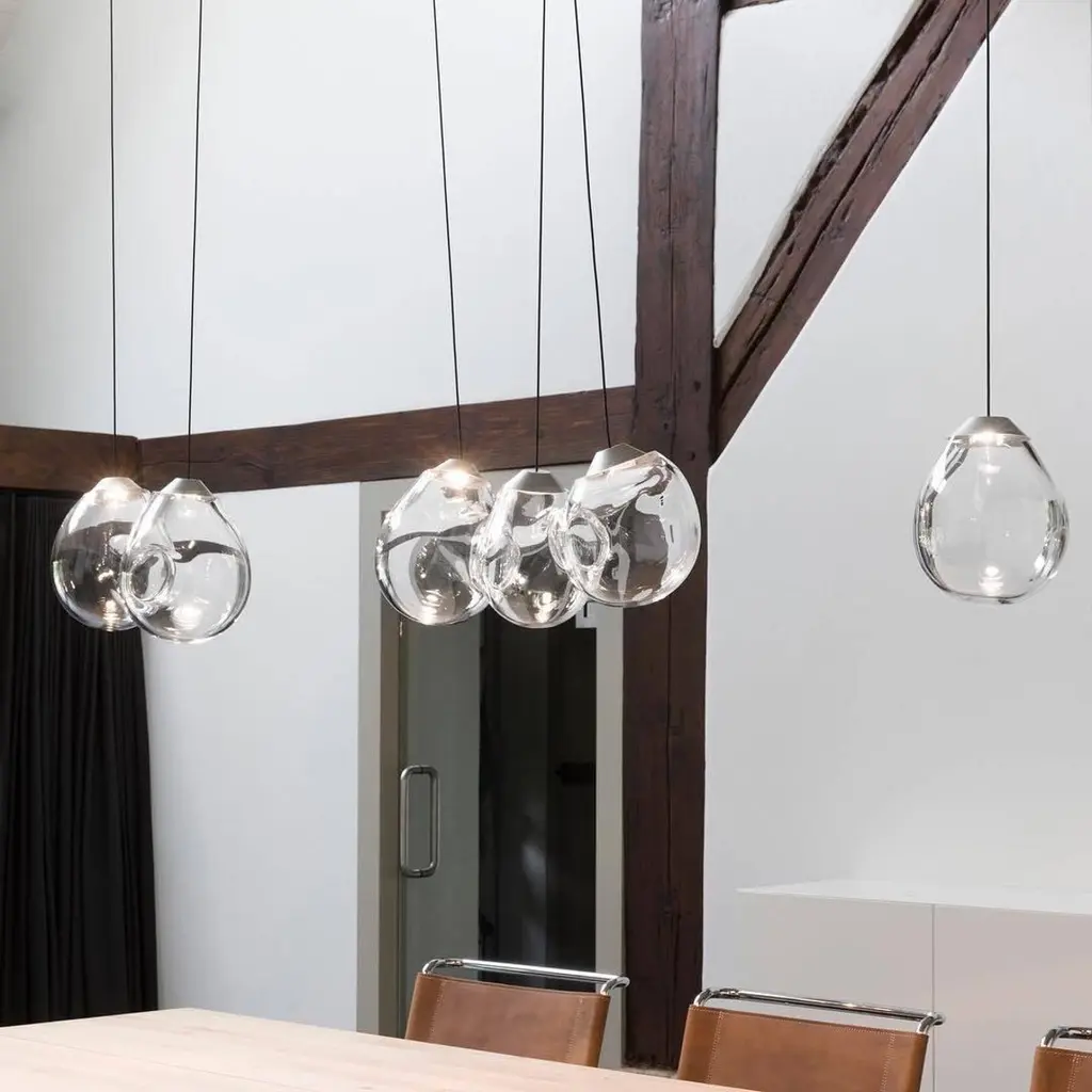 Triple momentum blown glass pendants by Alex de WitteDimensions: 50 - 70 cmMaterials: Mouth blown glassAll pieces are unique and available in different sets:-Single 20-25 cm-Double 30-40 cm-Triple 60-70 cmWith the Momentum Alex de Witte has found the prefect artistic defining moment while playing with the boundaries of glass blowing in yet another dimension. He's frozen a significant moment in time in which he invites the beholder to ask himself a multitude of questions. Here Alex plays with the suggestion of perpetual motion. This 'moment of meaningful suspense' is like the key to free the imagination of the viewer. You can't help it but curious; you can't help it but fill in the gaps (...). All our lamps can be wired according to each country. If sold to the USA it will be wired for the USA for instance.Alex de Witte is fascinated by the universal value of beauty and how to influence that. “It is fascinating to me how people have an overall communal perception of beauty. Like scientific studies have proven over the years, symmetry, repetition, balance and harmony with nature affect people’s IDEA of perfectness. As a designer it is my quest to try to influence the phenomenon of beauty being found in the beholder’s eye. I aim to play with general perception of beauty and to open up peoples minds in that process.” Alex de Witte constantly forces his own perspective and consequently that of the beholder’s, by twisting the perception of shape and form. Alex is pushing the boundaries of catching the perfect moment in the process of a new work. Is it the so called pregnant moment or the moment right after or even before, which shapes the perfect form? Exactly that playful balance in the process of each work, is what he translates into the ‘initial moment of things’. Every time, Alex first determines strict boundaries within a new design process. After this realm is set considering these limitations, he is searching for the right symmetry and balance that will determine the final form of the new design.All our lamps can be wired according to each country. If sold to the USA it will be wired for the USA for instance.