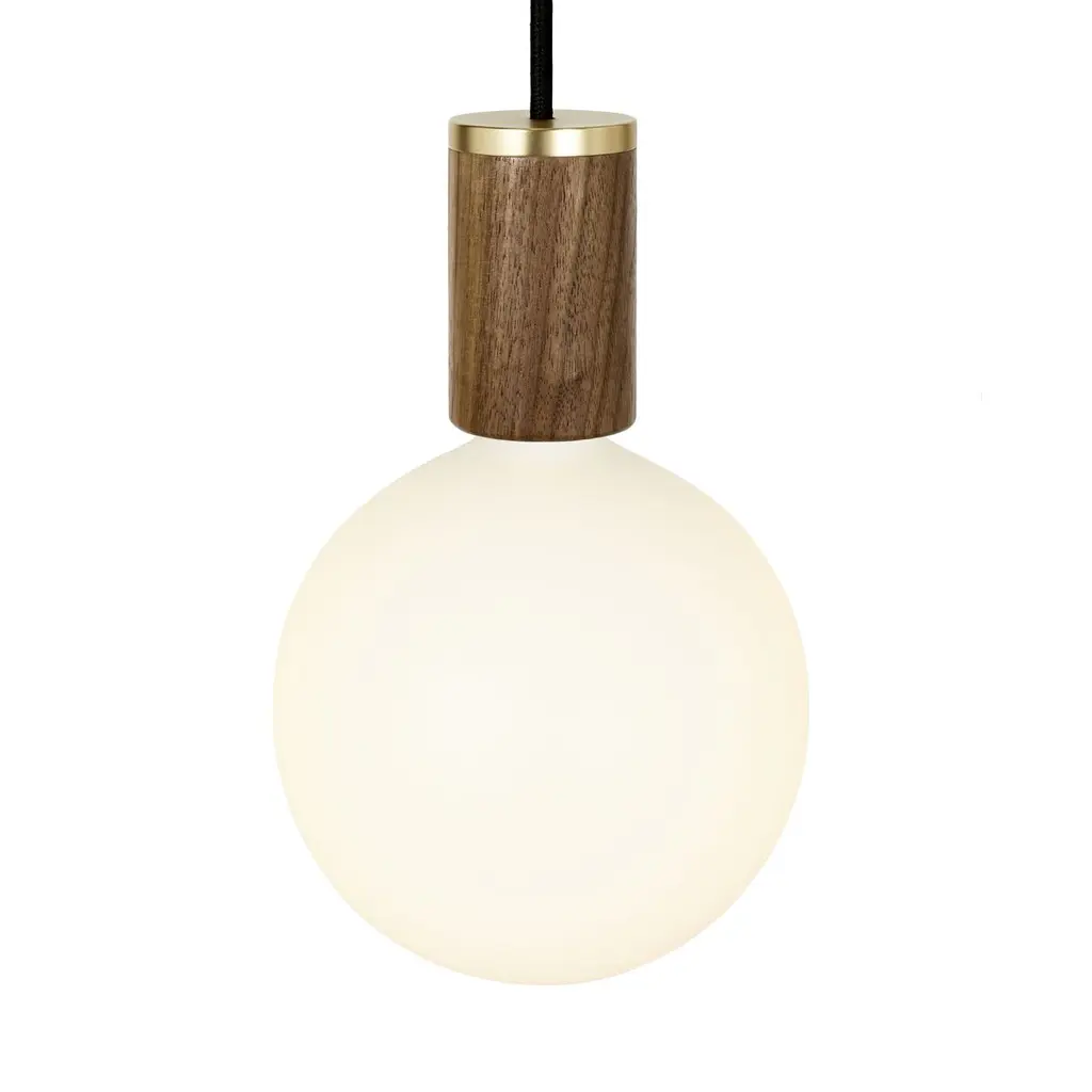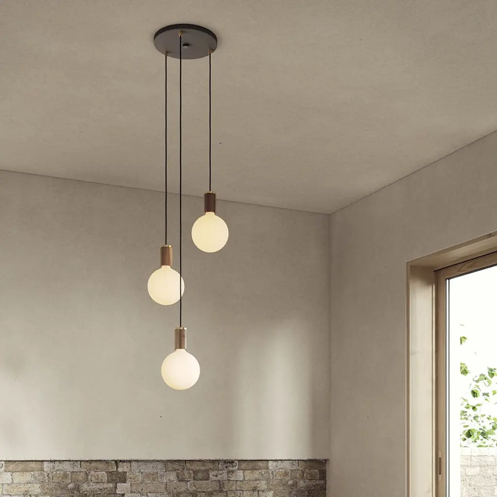 The matte-white finish of the oversize round LED bulbs provides a graphic contrast to the graphite canopy and cords and the walnut bulb caps of this three-bulb pendant.