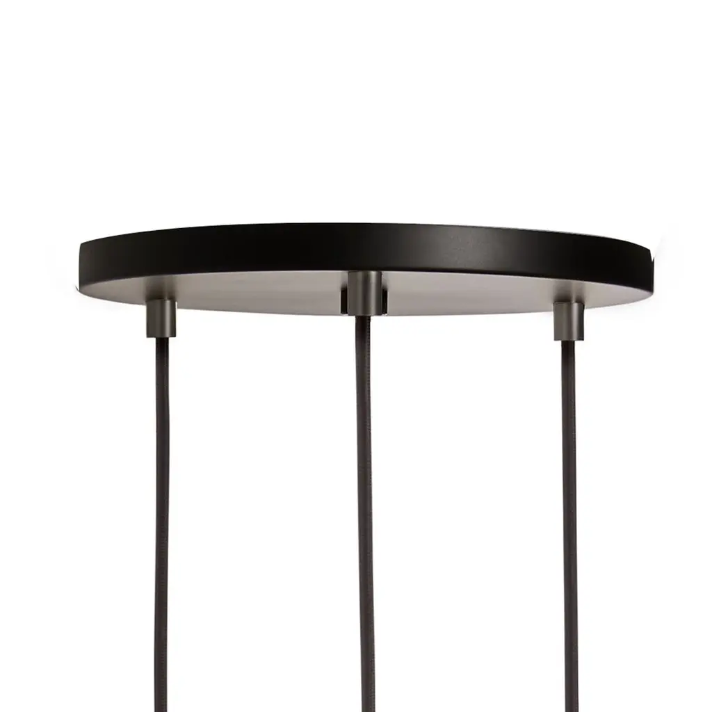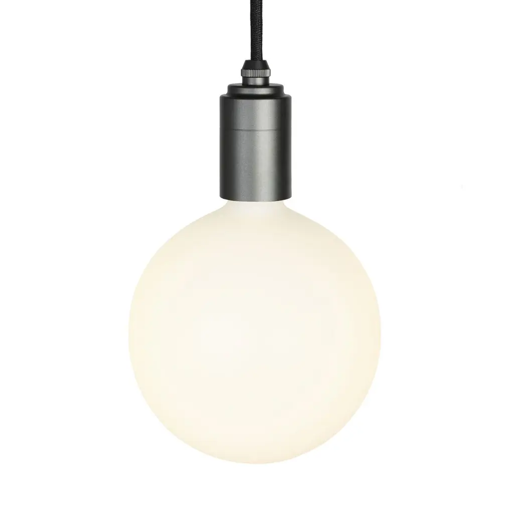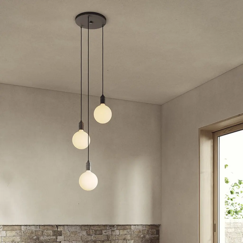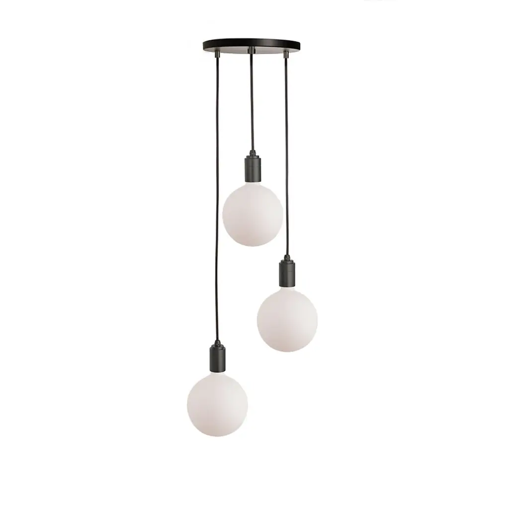 The matte-white finish of the oversize round LED bulbs provides a graphic contrast to the graphite cords, canopy, and bulb caps of this three-bulb pendant.