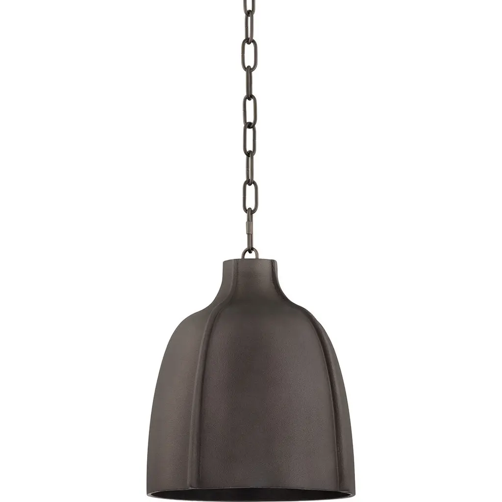 Collection: Flint, Material: Brass, Finish Color: Blackened Graphite, Width: 12.75", Height: 14", Chain Length: 72", Lamping Type: Incandescent, Number Of Bulbs: 1, Wattage: 75 Watts, Moisture Rating: Damp Rated, Desc: With its unique Blackened Graphite finish and cast-aluminum shade, Flint is sure to spark interest. The purposely textured shade and seam on the outside add to the piece's industrial vibe. Available in two different sizes, these pendants will light up any space with a cool style.,