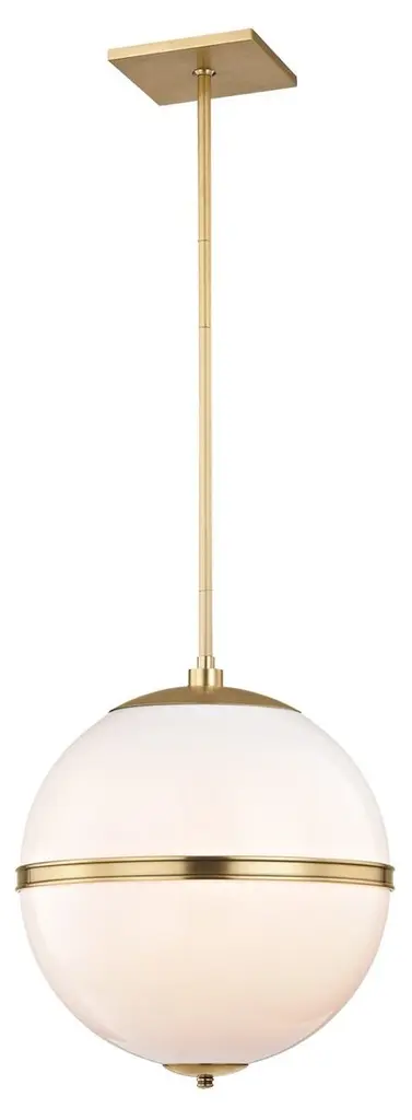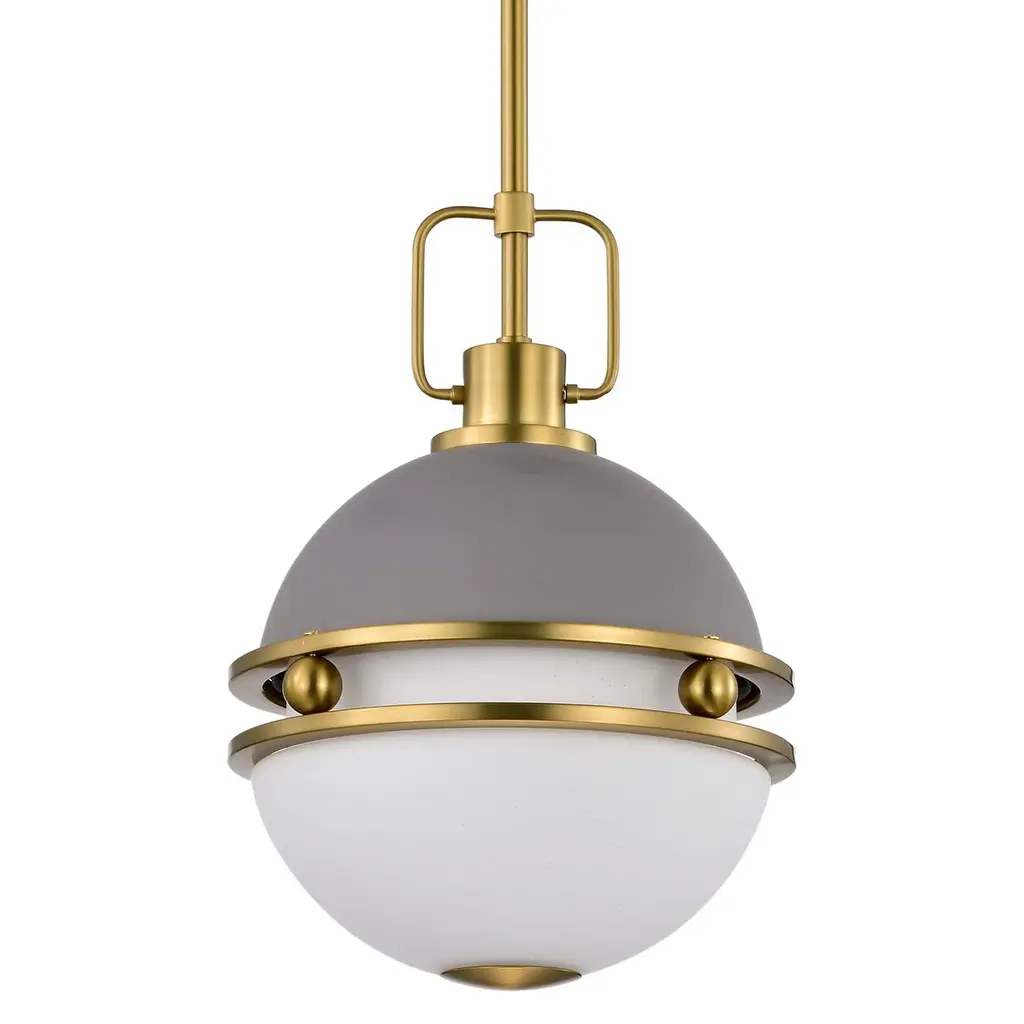 A slender band of steel bisects this pendant's lucite globe shade, beautifully embellished with aged-brass detailing. Hardwired.