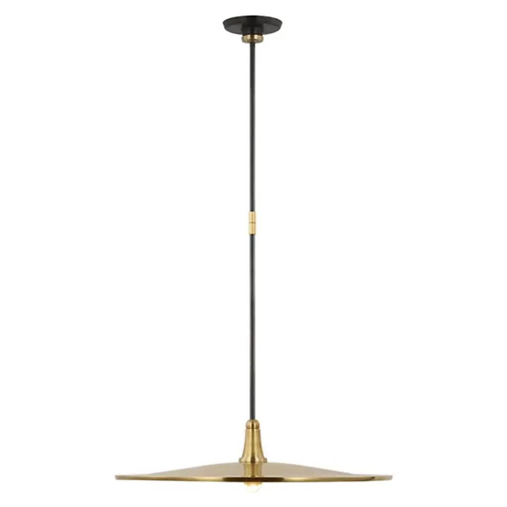 The Truesdell LED Pendant from Visual Comfort Signature provides a tasteful modern appeal to interiors. The Thomas O’Brien design extends from a bevel-edged disc canopy; it sends down a jointed, central stem to a conical housing holding strong LED lamping. A shallow dish shade flares out around the lamping, providing a clean-surfaced contrast to the rich metal above and reflecting a radiant warmth evenly around the fixture