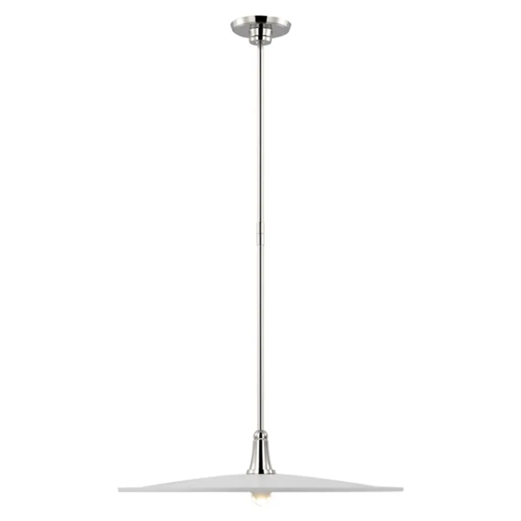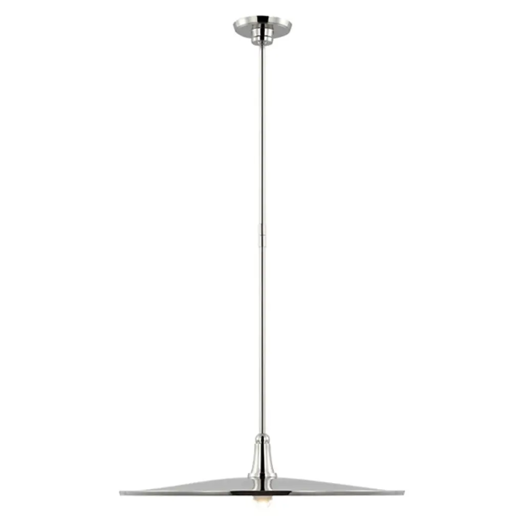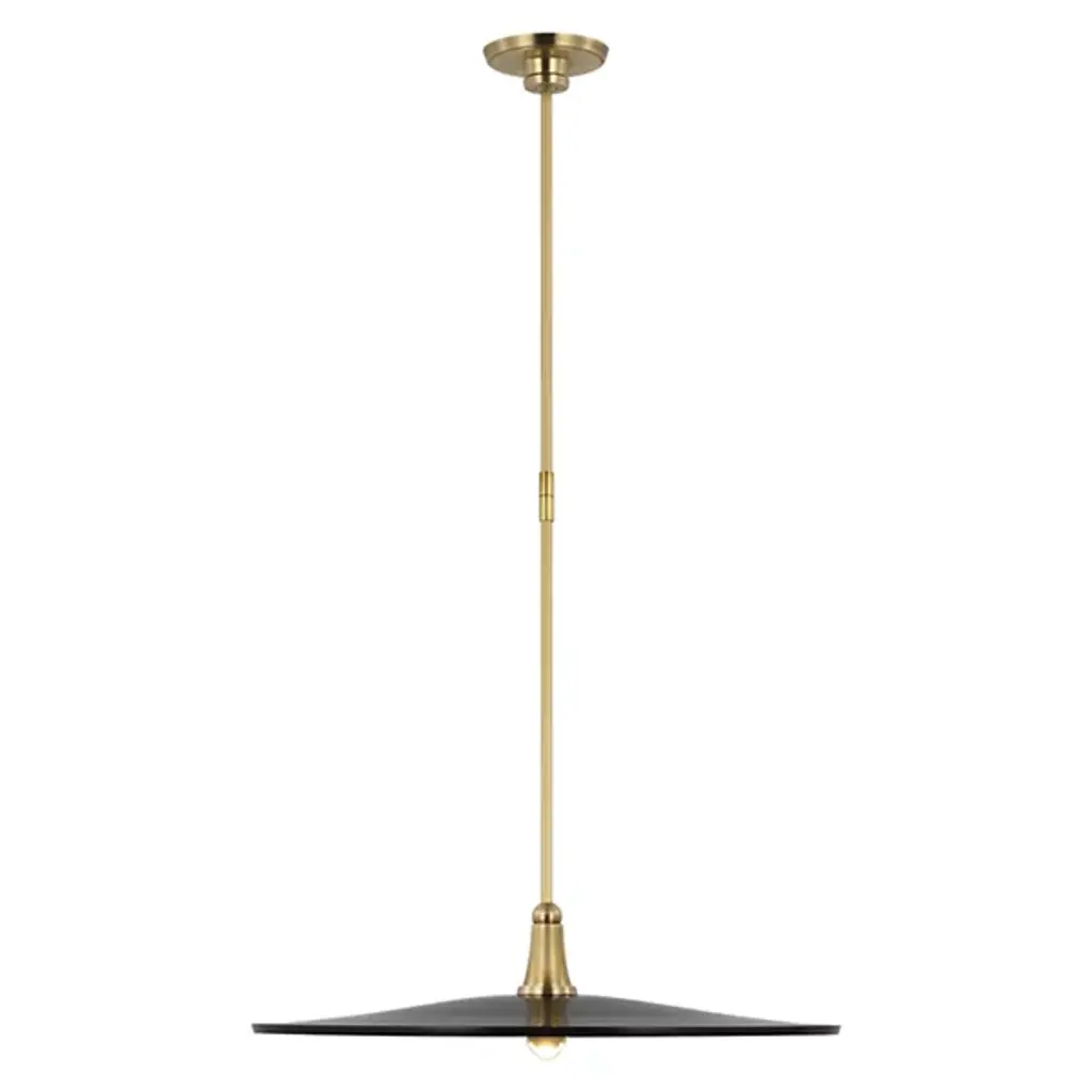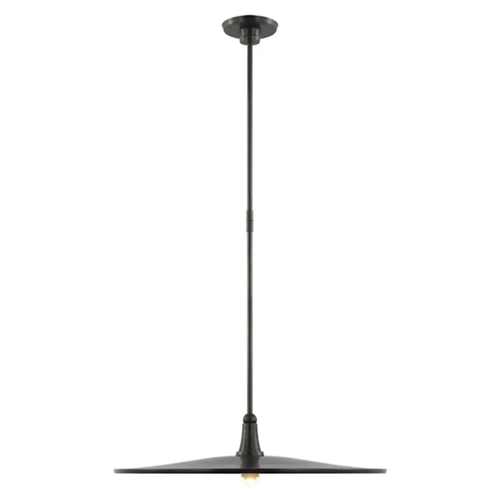 The Truesdell LED Pendant from Visual Comfort Signature provides a tasteful modern appeal to interiors. The Thomas O’Brien design extends from a bevel-edged disc canopy; it sends down a jointed, central stem to a conical housing holding strong LED lamping. A shallow dish shade flares out around the lamping, providing a clean-surfaced contrast to the rich metal above and reflecting a radiant warmth evenly around the fixture