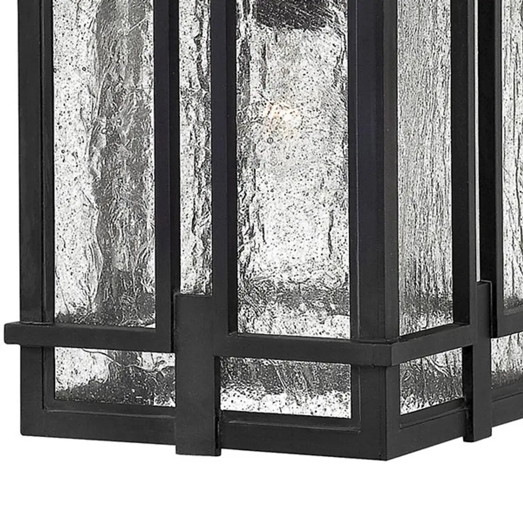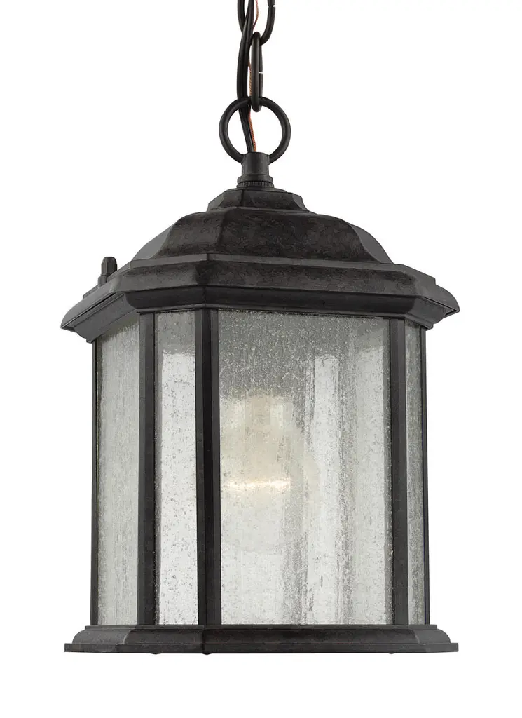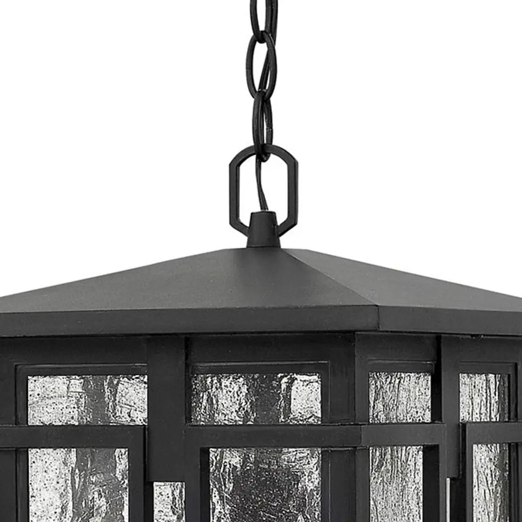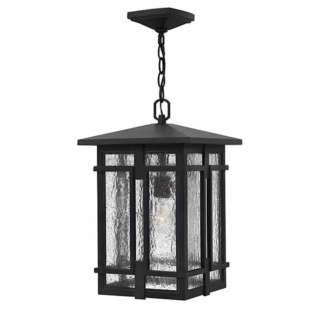 Lend a soft glow to covered outdoor spaces with the tasteful, traditional lines of the Tucker Outdoor Pendant from Hinkley Lighting. Suspended from a square-based, trapezoidal canopy via a short length of chain, it sets a single, damp-listed lamp inside a Mission-influenced lantern structure that pairs a vertically-oriented rectangle frame with a shallow, four-sided roof. A horizontal diffuser of clear seedy glass surrounds the lamping on the inside of the aluminum frame, cutting glare from the lamping and transforming it into a mix of warm ambiance to the sides surrounding a pleasing downlight cast through its open base.