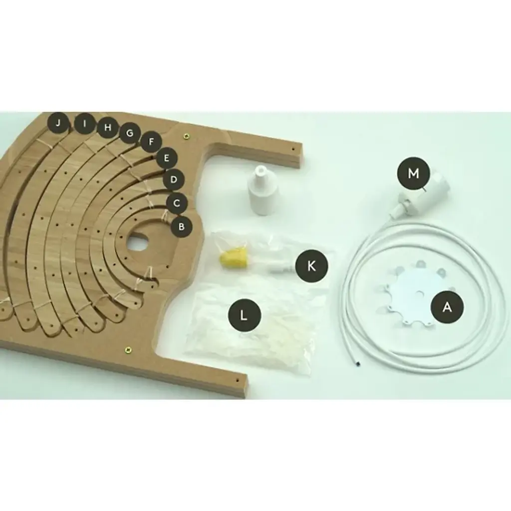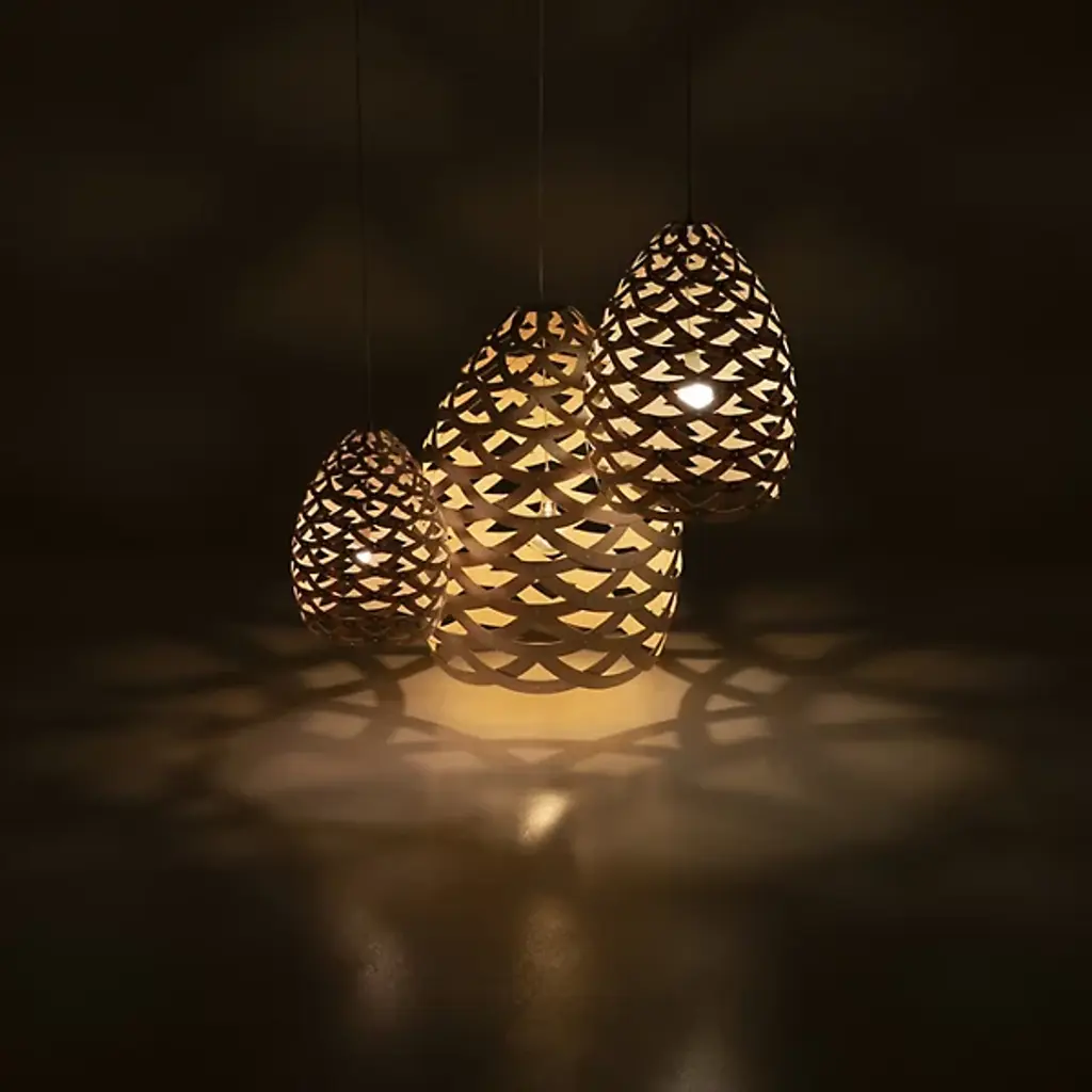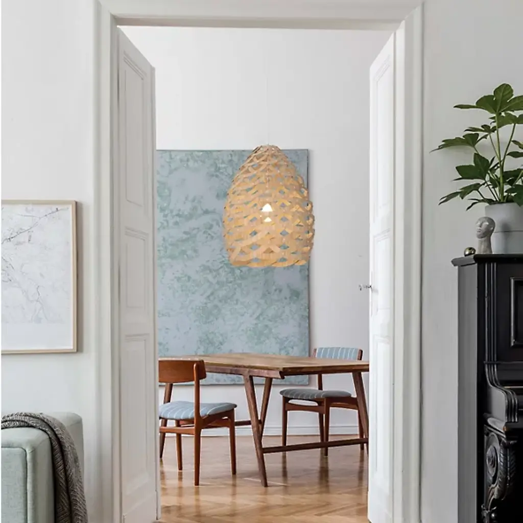 Cleverly crafted, with a personal touch. The Tui Pendant from David Trubridge pays homage to the distinctive spirit of the playful Tui, a playful bird native to Aotearoa or New Zealand, known for dodging between branches while emitting a signature call. The fixture itself is a deceptively simple assembly that ships as a flat kit for minimum environmental impact and assembles easily, incorporating potent lamping that sits beneath a single cable and powder-coated aluminum fittings. This lamping and its housing rest inside an open, conical structure made of bamboo plywood curves joined together at multiple points. Its final shape resembles one of the unique white wattles on the throat of the Tui that help channel its call, and it gentles glare from within while splashing out a warm pool of downlight below.
