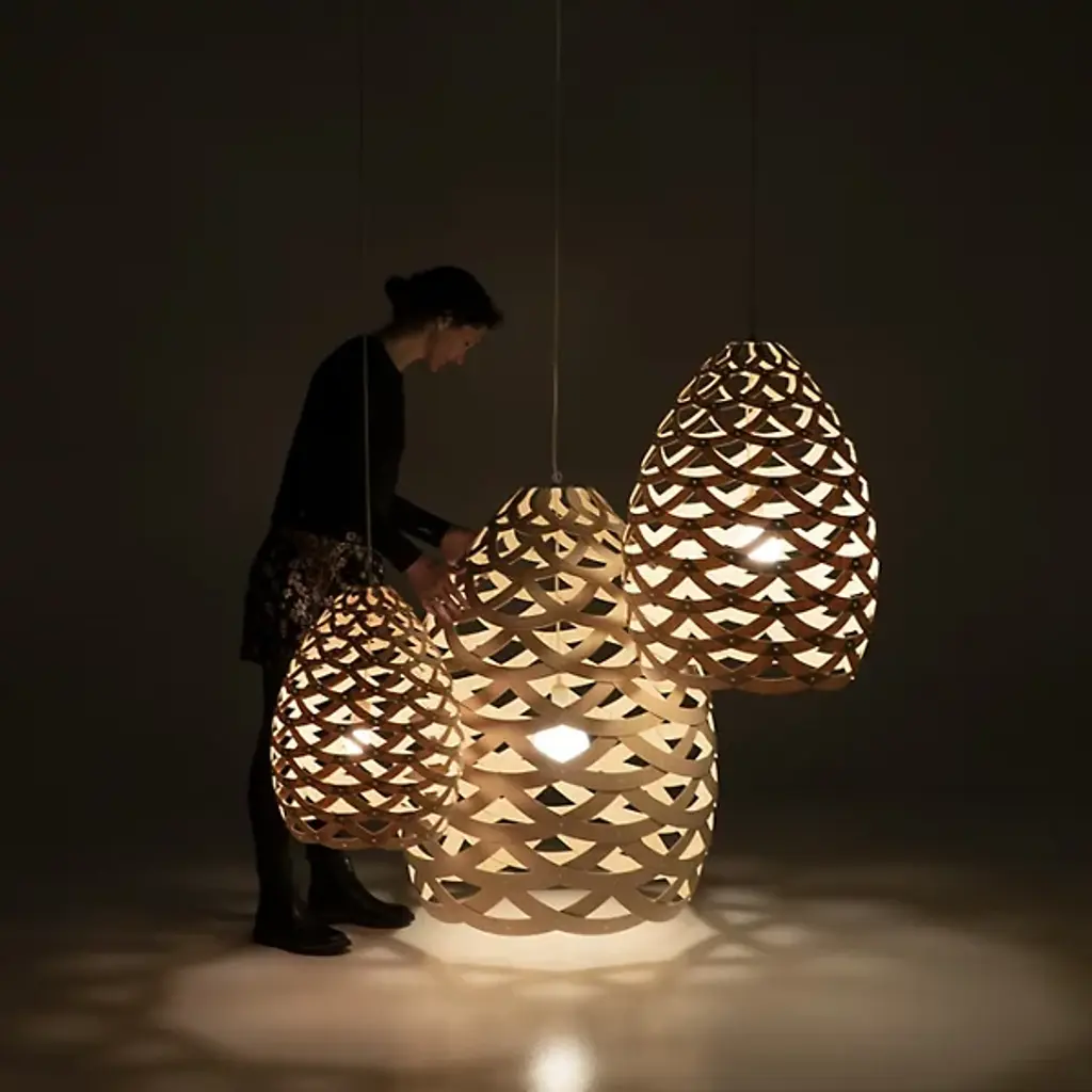 Cleverly crafted, with a personal touch. The Tui Pendant from David Trubridge pays homage to the distinctive spirit of the playful Tui, a playful bird native to Aotearoa or New Zealand, known for dodging between branches while emitting a signature call. The fixture itself is a deceptively simple assembly that ships as a flat kit for minimum environmental impact and assembles easily, incorporating potent lamping that sits beneath a single cable and powder-coated aluminum fittings. This lamping and its housing rest inside an open, conical structure made of bamboo plywood curves joined together at multiple points. Its final shape resembles one of the unique white wattles on the throat of the Tui that help channel its call, and it gentles glare from within while splashing out a warm pool of downlight below.