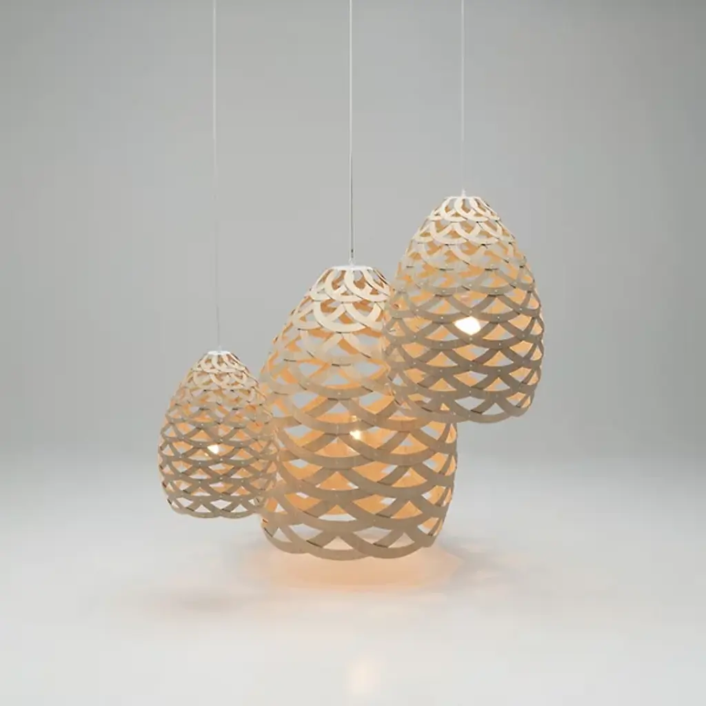 Cleverly crafted, with a personal touch. The Tui Pendant from David Trubridge pays homage to the distinctive spirit of the playful Tui, a playful bird native to Aotearoa or New Zealand, known for dodging between branches while emitting a signature call. The fixture itself is a deceptively simple assembly that ships as a flat kit for minimum environmental impact and assembles easily, incorporating potent lamping that sits beneath a single cable and powder-coated aluminum fittings. This lamping and its housing rest inside an open, conical structure made of bamboo plywood curves joined together at multiple points. Its final shape resembles one of the unique white wattles on the throat of the Tui that help channel its call, and it gentles glare from within while splashing out a warm pool of downlight below.