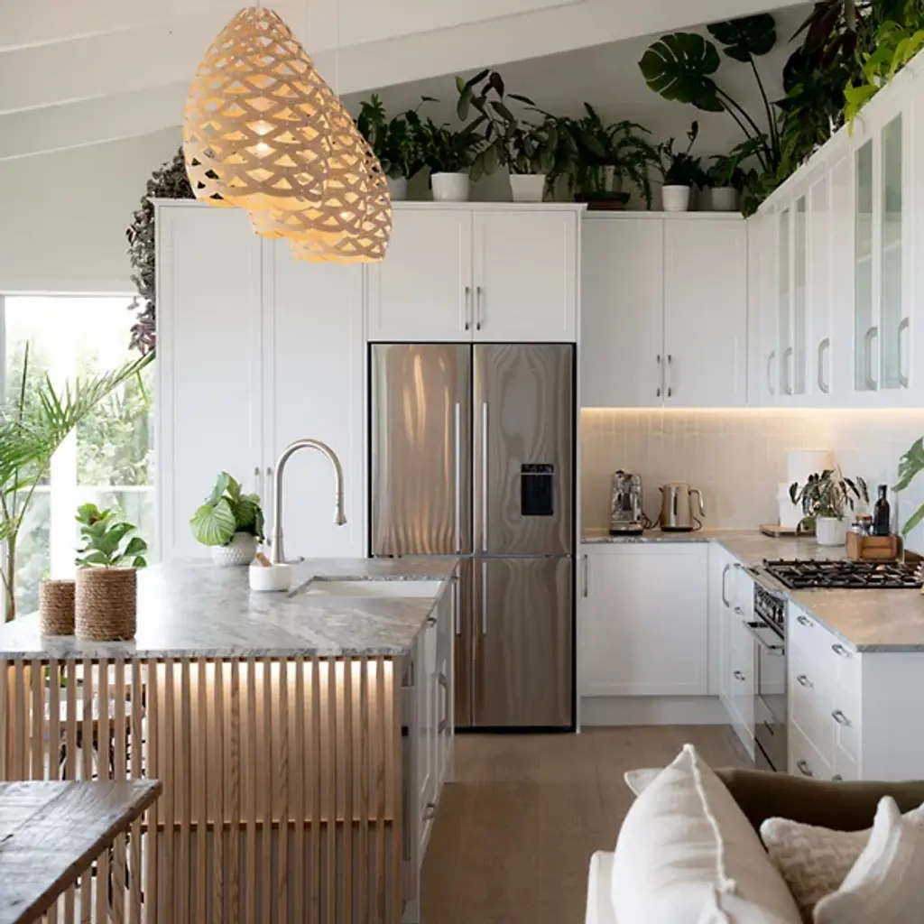 Cleverly crafted, with a personal touch. The Tui Pendant from David Trubridge pays homage to the distinctive spirit of the playful Tui, a playful bird native to Aotearoa or New Zealand, known for dodging between branches while emitting a signature call. The fixture itself is a deceptively simple assembly that ships as a flat kit for minimum environmental impact and assembles easily, incorporating potent lamping that sits beneath a single cable and powder-coated aluminum fittings. This lamping and its housing rest inside an open, conical structure made of bamboo plywood curves joined together at multiple points. Its final shape resembles one of the unique white wattles on the throat of the Tui that help channel its call, and it gentles glare from within while splashing out a warm pool of downlight below.