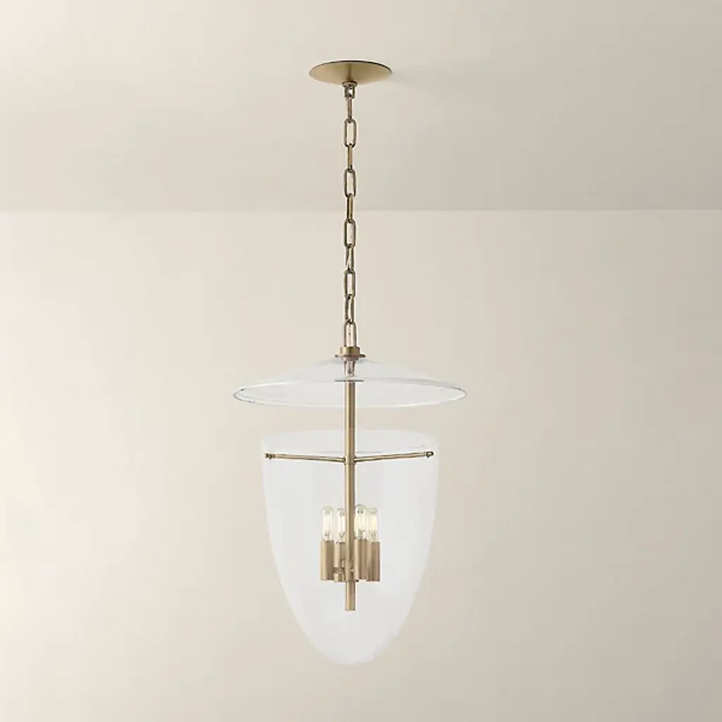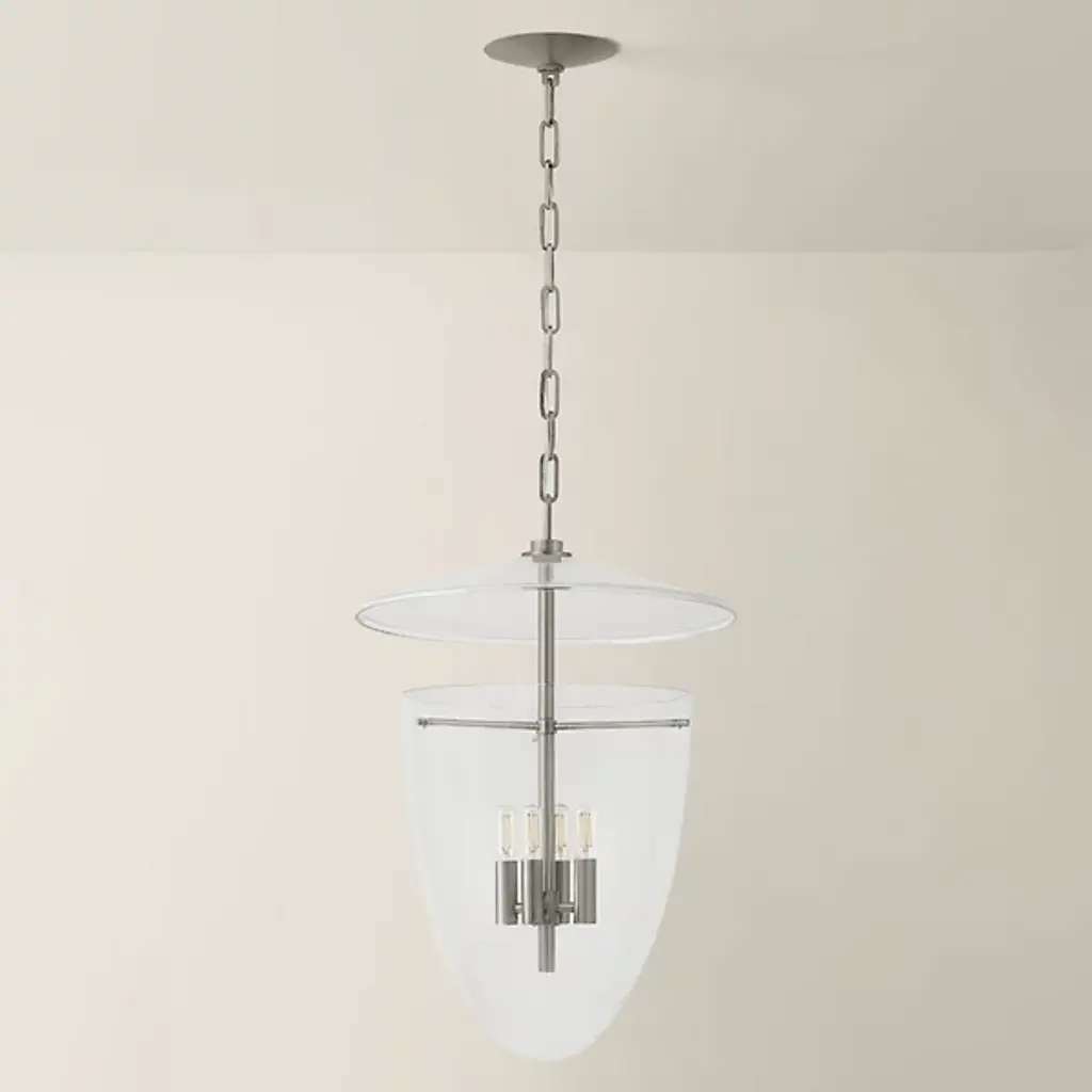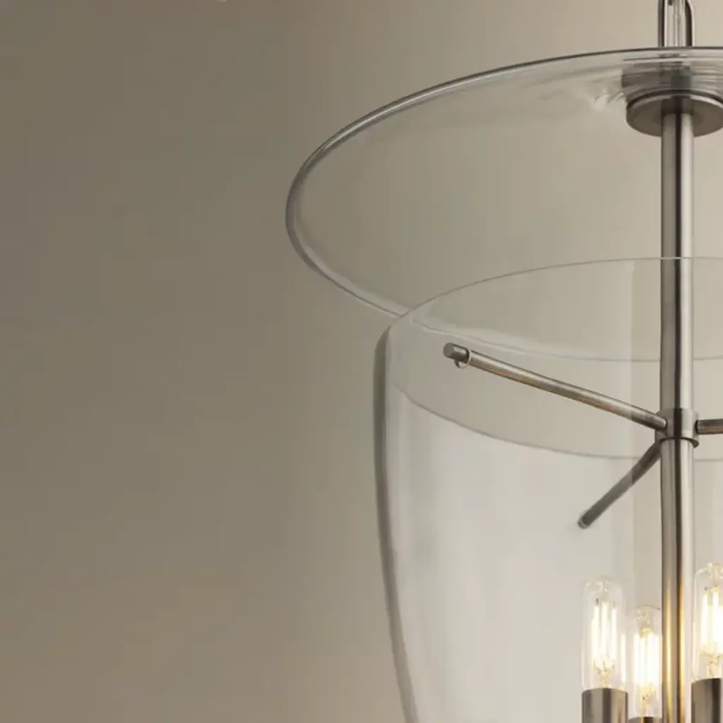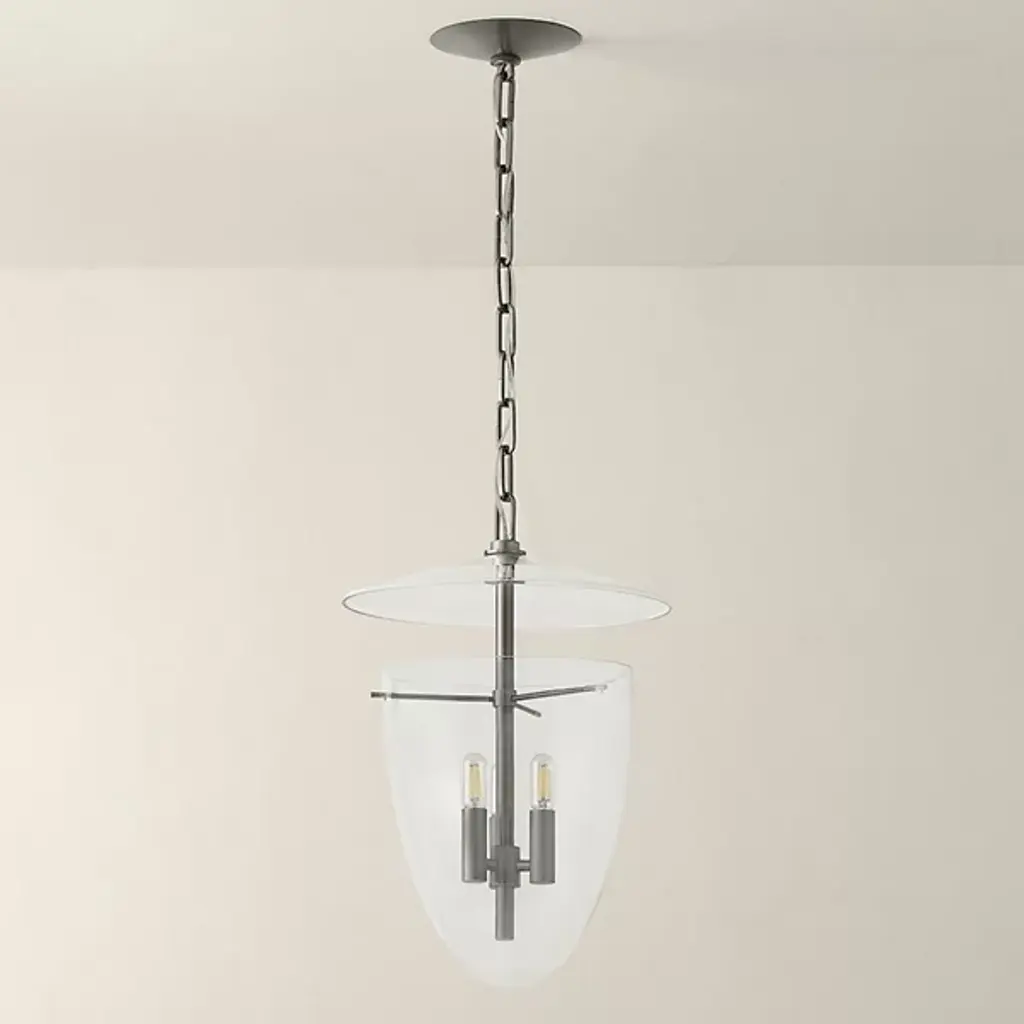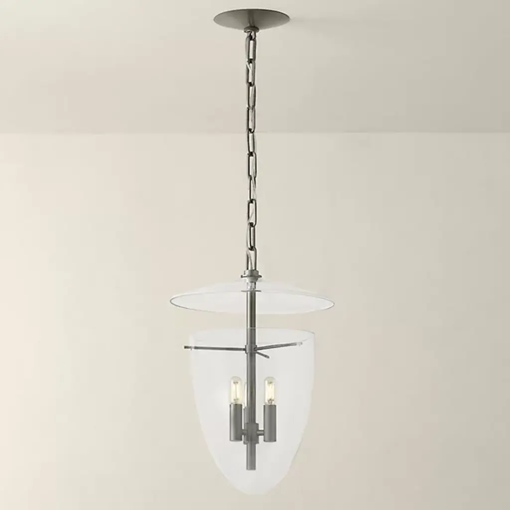 The Tully Pendant from Troy Lighting presents an inverted bell jar silhouette crafted entirely from clear glass. A suspended disc at the crown creates an unexpected detail within the transparent form, while exposed metalwork remains visible through the glass walls. The lantern-style construction houses multiple light sources arranged vertically along a central stem. This pendant's all-glass design offers unobstructed views of the internal components, making the fixture's mechanical elements an integral part of its visual appeal.