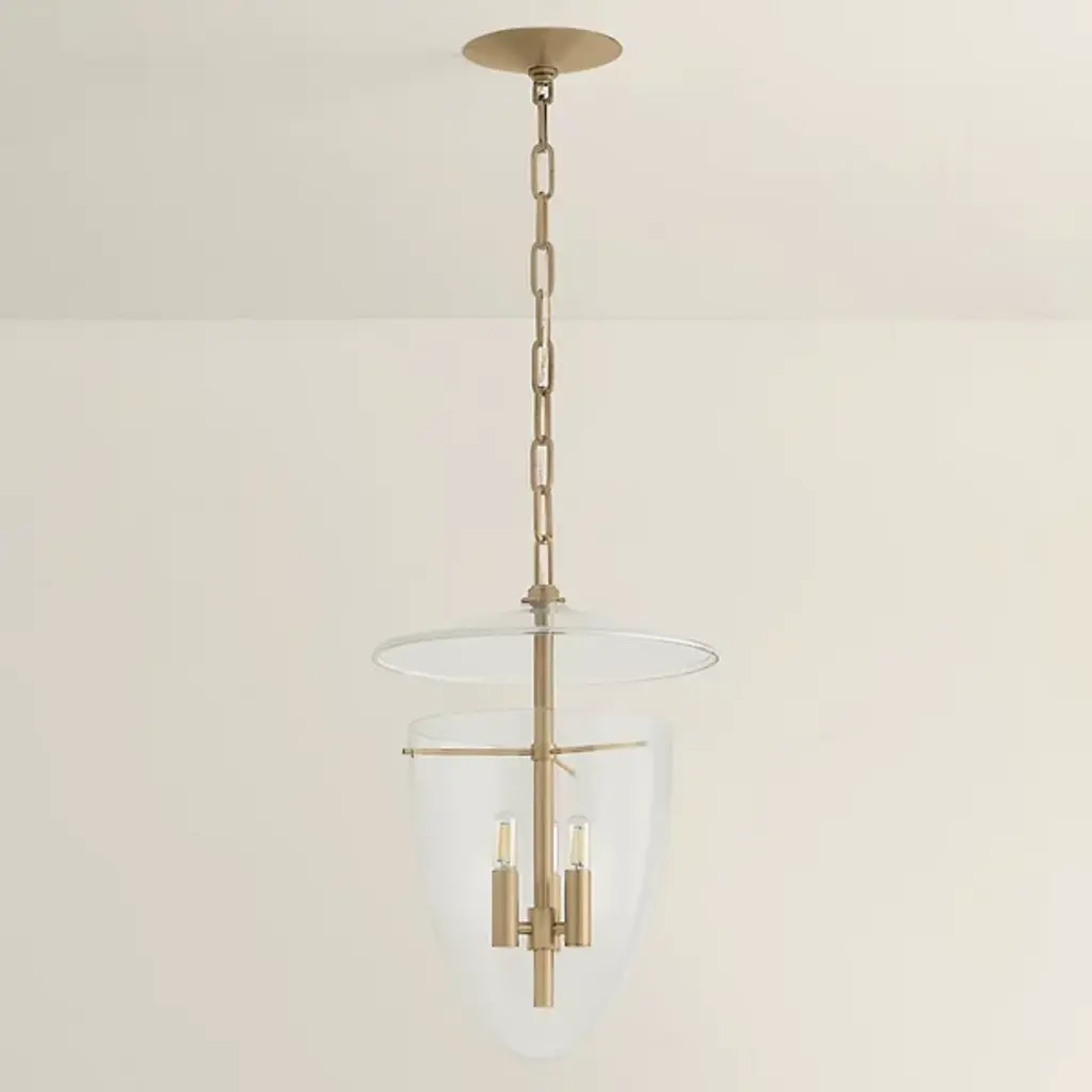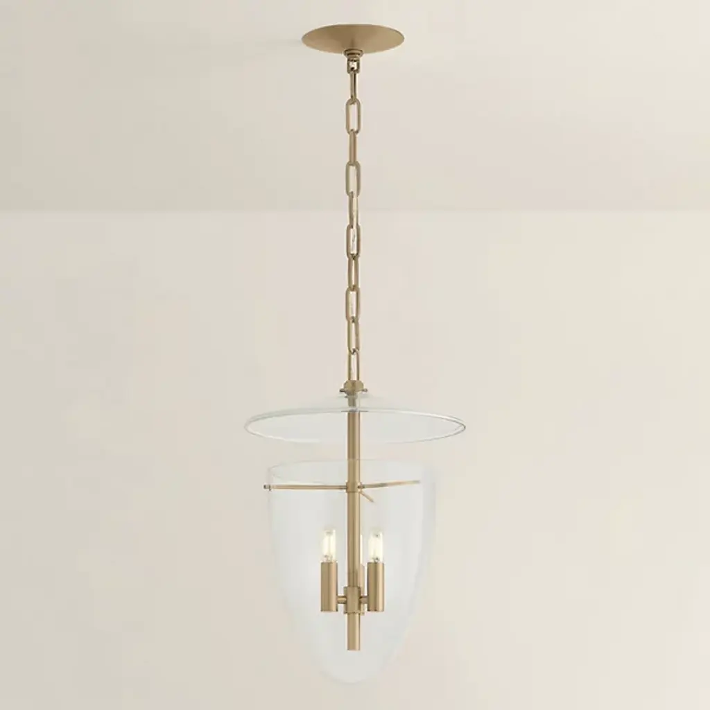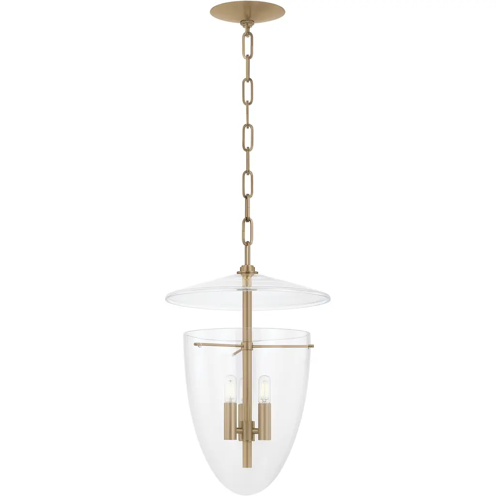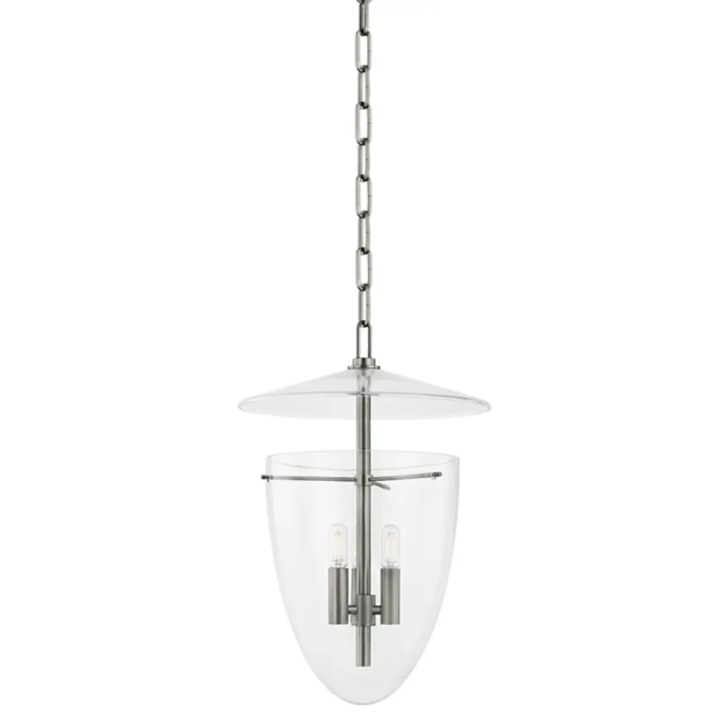 The Tully Pendant from Troy Lighting presents an inverted bell jar silhouette crafted entirely from clear glass. A suspended disc at the crown creates an unexpected detail within the transparent form, while exposed metalwork remains visible through the glass walls. The lantern-style construction houses multiple light sources arranged vertically along a central stem. This pendant's all-glass design offers unobstructed views of the internal components, making the fixture's mechanical elements an integral part of its visual appeal.