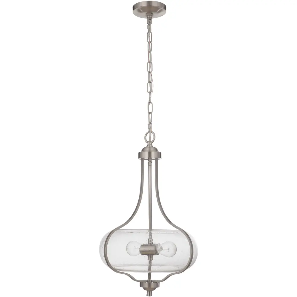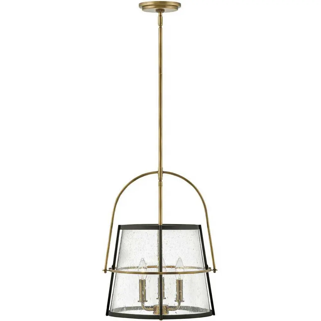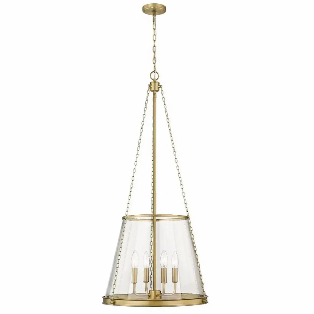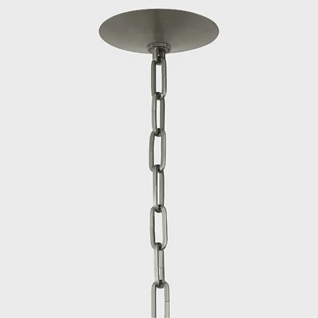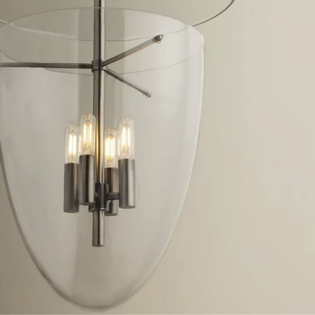 The Tully Pendant from Troy Lighting presents an inverted bell jar silhouette crafted entirely from clear glass. A suspended disc at the crown creates an unexpected detail within the transparent form, while exposed metalwork remains visible through the glass walls. The lantern-style construction houses multiple light sources arranged vertically along a central stem. This pendant's all-glass design offers unobstructed views of the internal components, making the fixture's mechanical elements an integral part of its visual appeal.