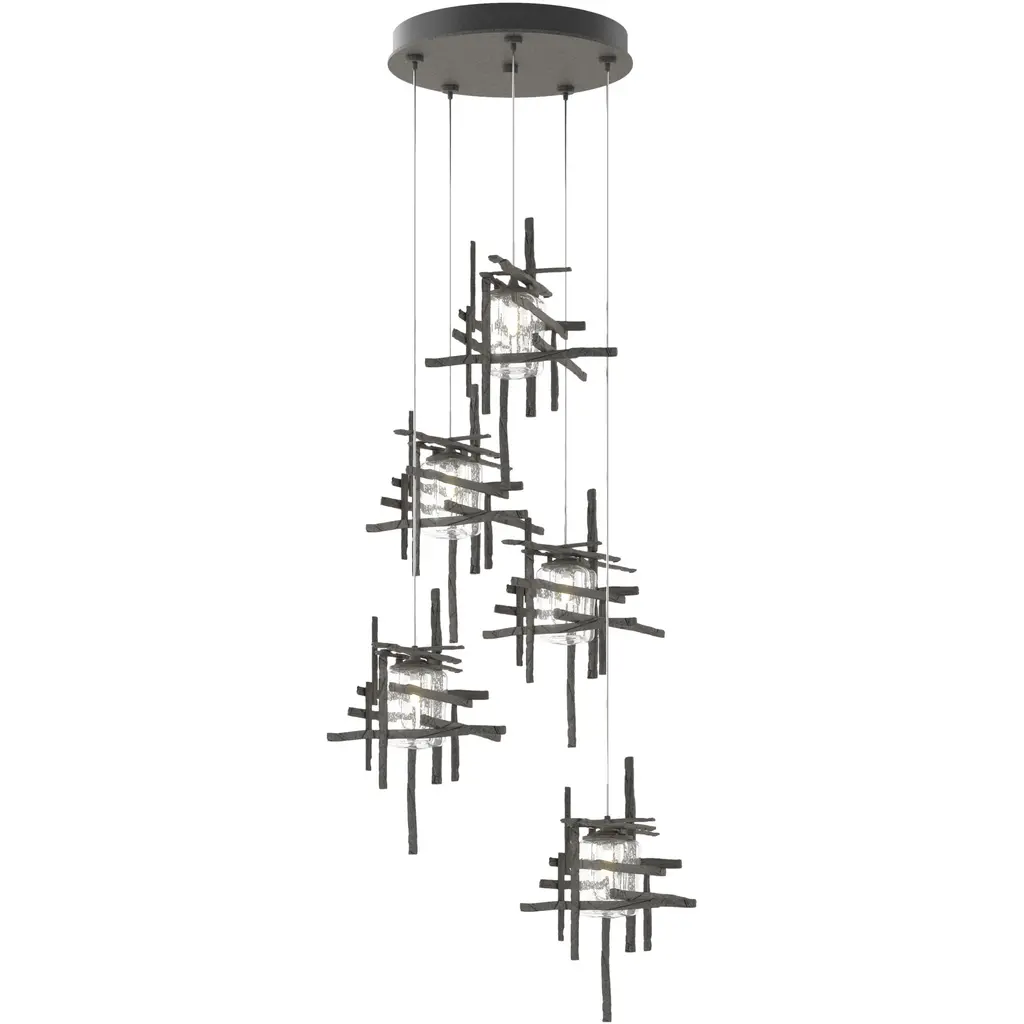 Thick, seeded clear glass shades are nestled within each of the Tura 5-Light Pendant’s modern, open, cage-like individual pendants. Perpendicular, intersecting pieces of hammered annealed aluminum, are painstakingly handmade with a trip hammer and dies by Vermont artisans. Easily customizable in length, the Tura is so versatile that you can feature it as a semi-flush or a longer pendant with cascading light with an easy cable adjustment.