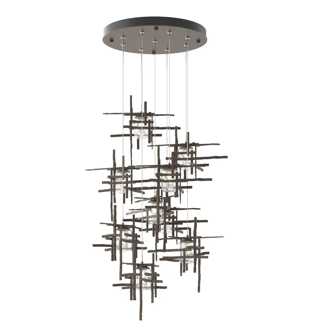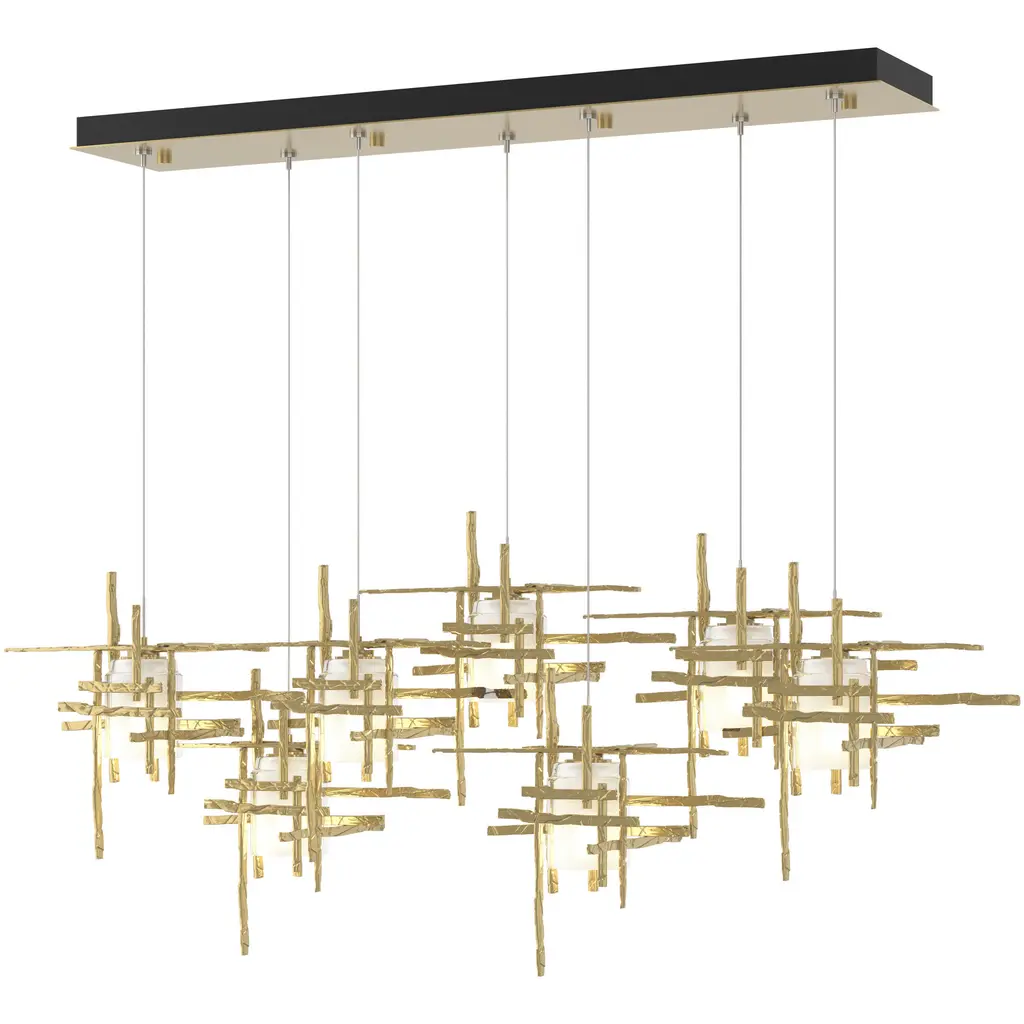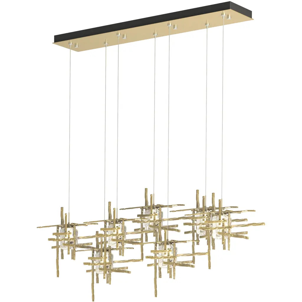 A linear multi-port pendant, this 7-Light Tura with its rectangular canopy offers both depth and dimension. Each intersecting piece is crafted from from annealed aluminum that are hand textured using a trip hammer and custom dies. This Tura Pendant's shades are made of thick, clear double layer seeded glass. Available in all standard finishes.