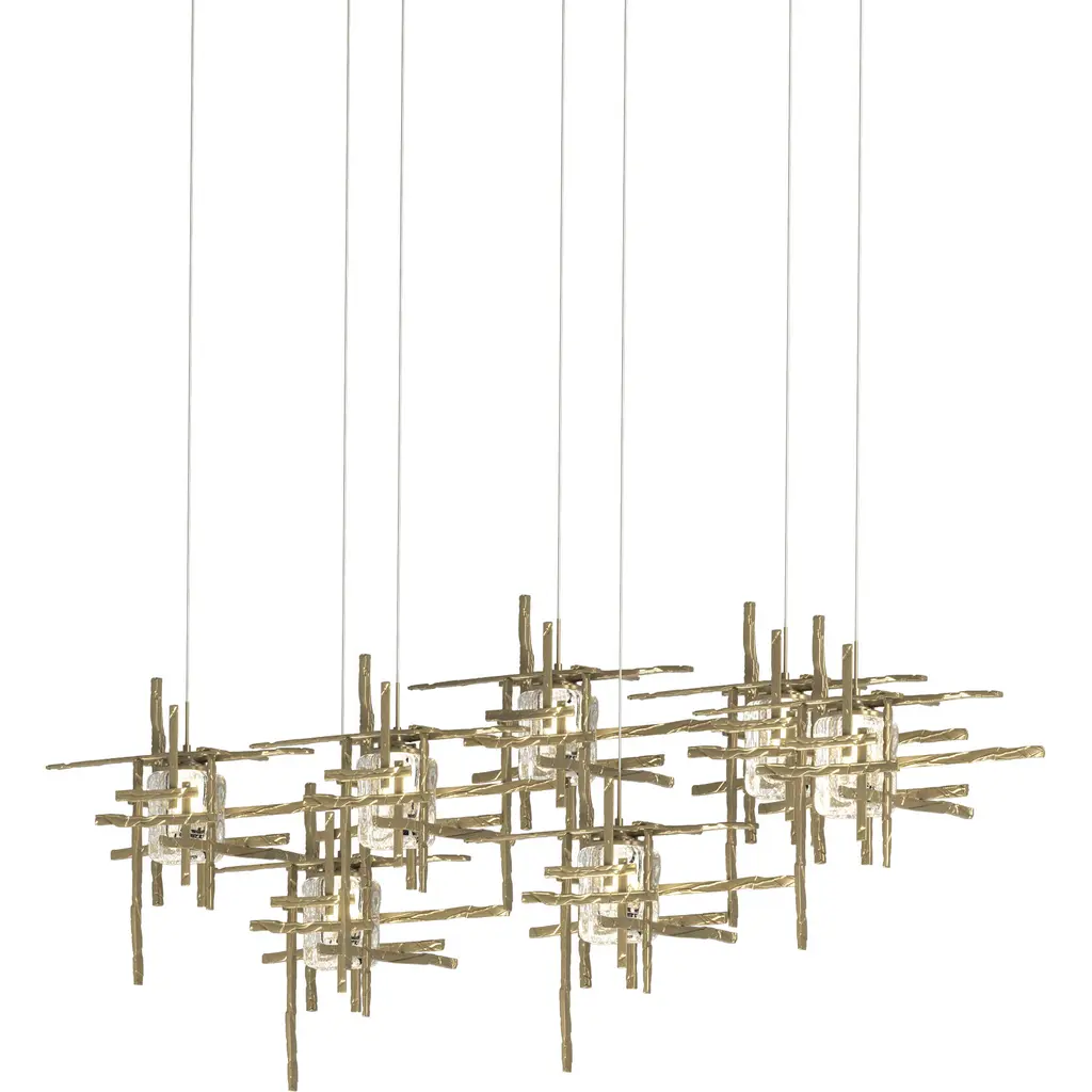 A linear multi-port pendant, this 7-Light Tura with its rectangular canopy offers both depth and dimension. Each intersecting piece is crafted from from annealed aluminum that are hand textured using a trip hammer and custom dies. This Tura Pendant's shades are made of thick, clear double layer seeded glass. Available in all standard finishes.