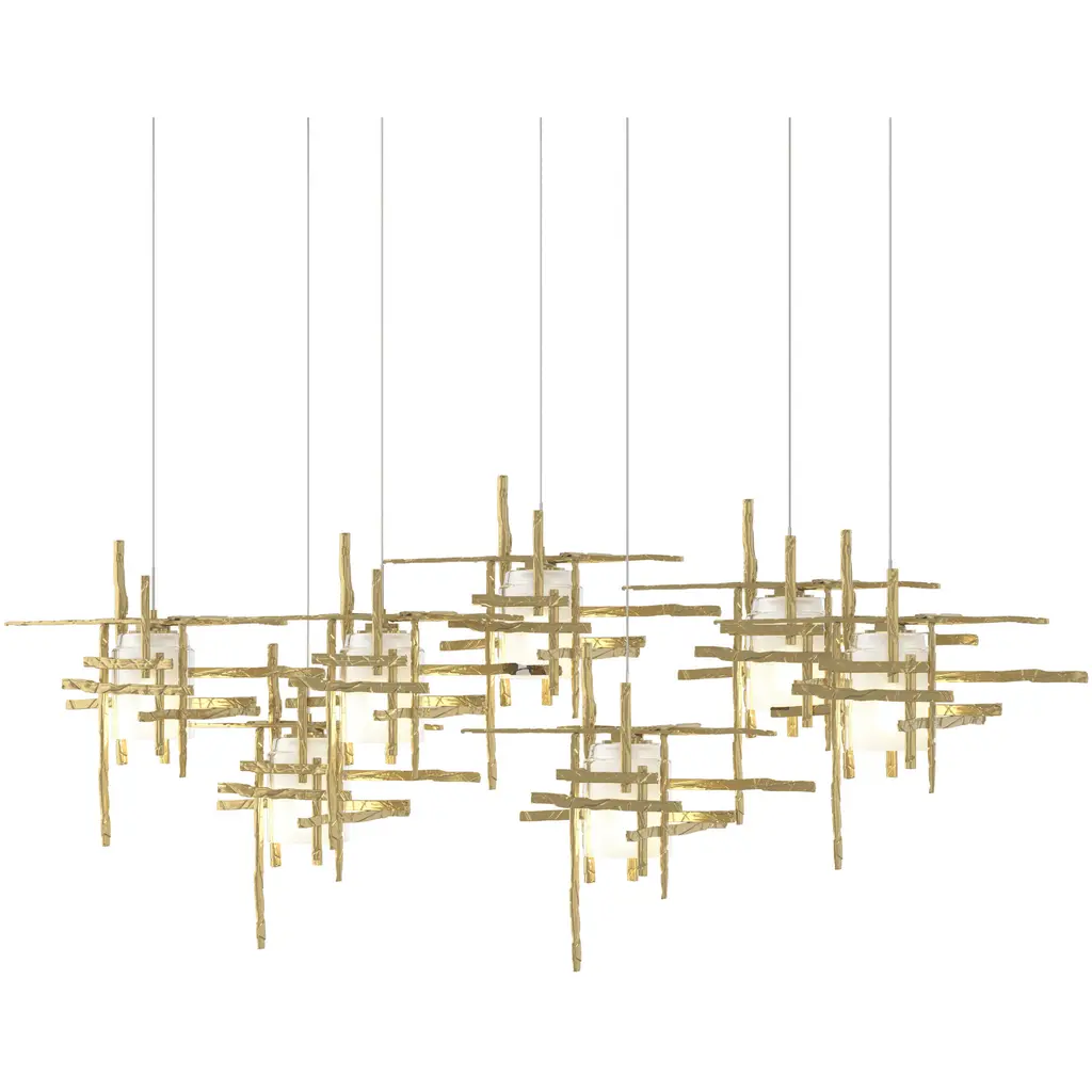 This 7-Light Tura with its rectangular canopy is a linear multi-port pendant, with both depth and dimension. Each intersecting piece is crafted from from annealed aluminum that are hand textured using a trip hammer and custom dies. This Tura Pendant's shades are made of simple, thick cylinders of frosted glass. Available in all standard finishes.