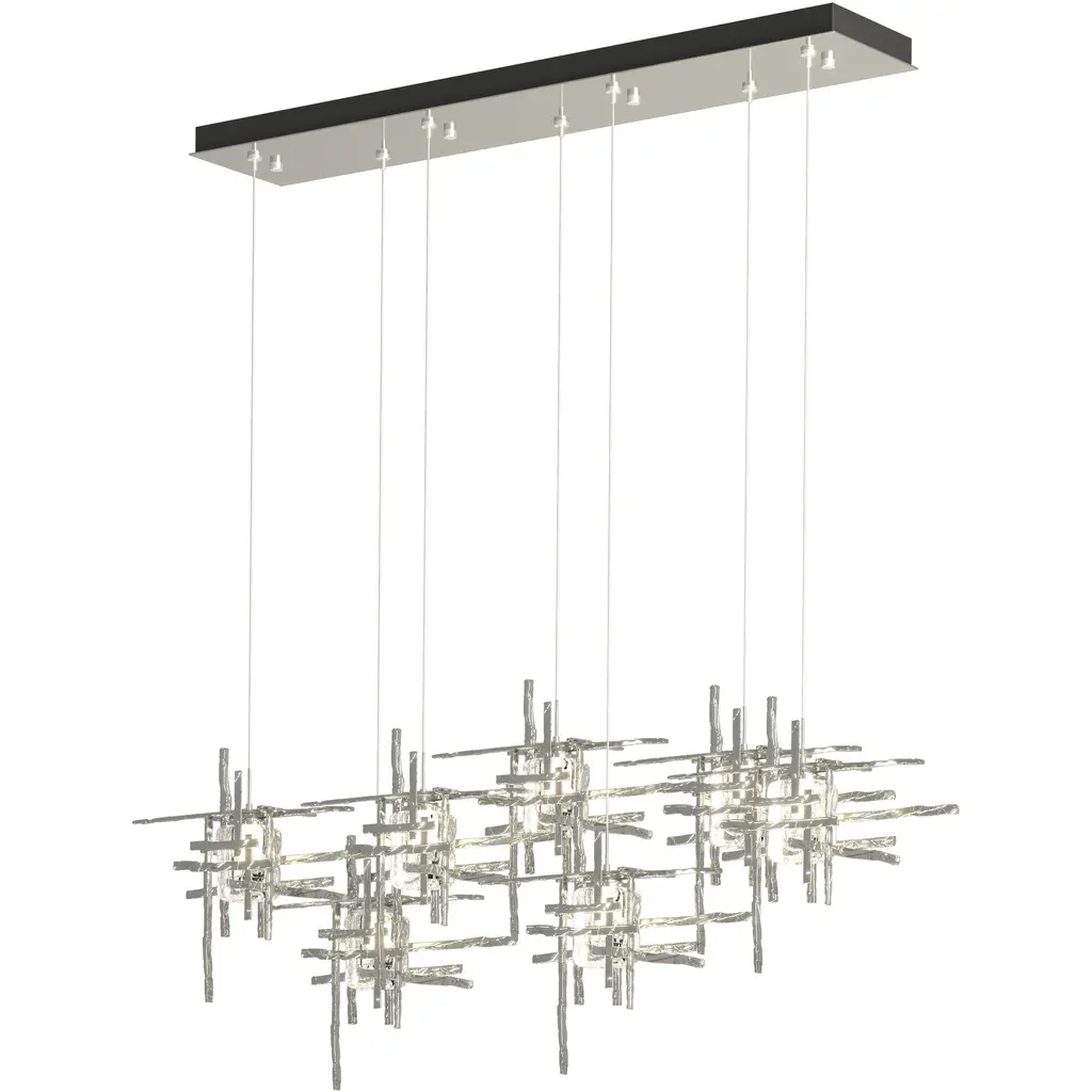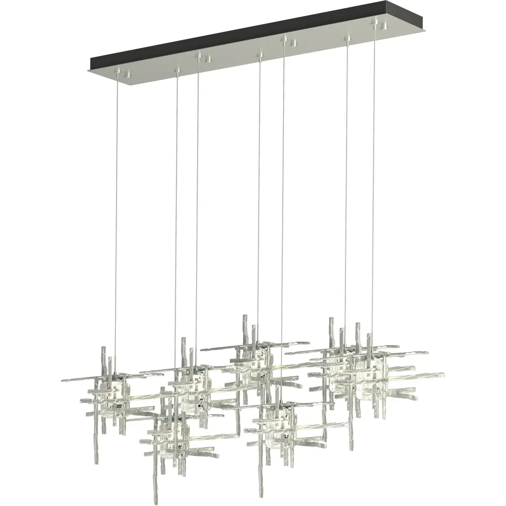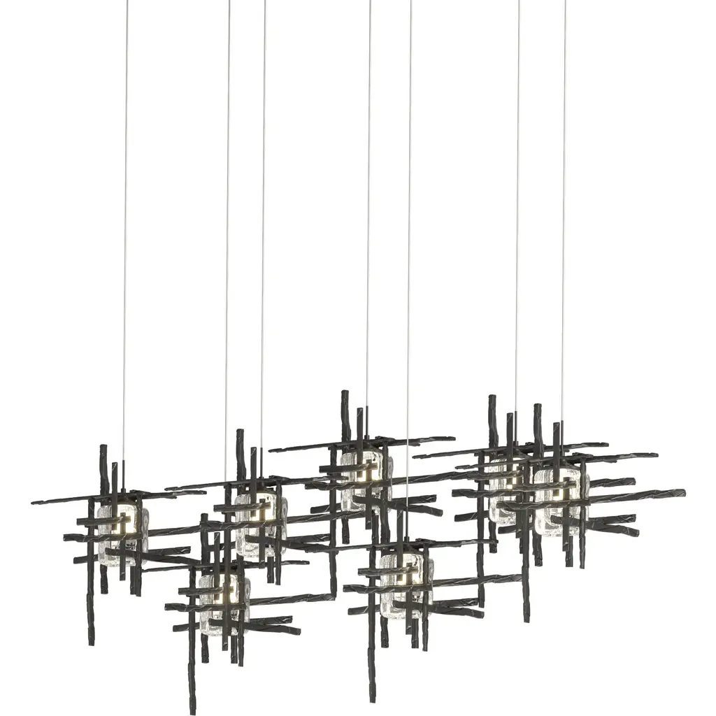 A linear multi-port pendant, this 7-Light Tura with its rectangular canopy offers both depth and dimension. Each intersecting piece is crafted from from annealed aluminum that are hand textured using a trip hammer and custom dies. This Tura Pendant's shades are made of thick, clear double layer seeded glass. Available in all standard finishes.