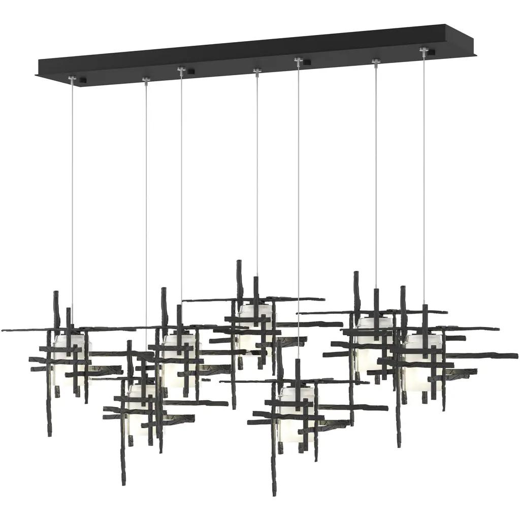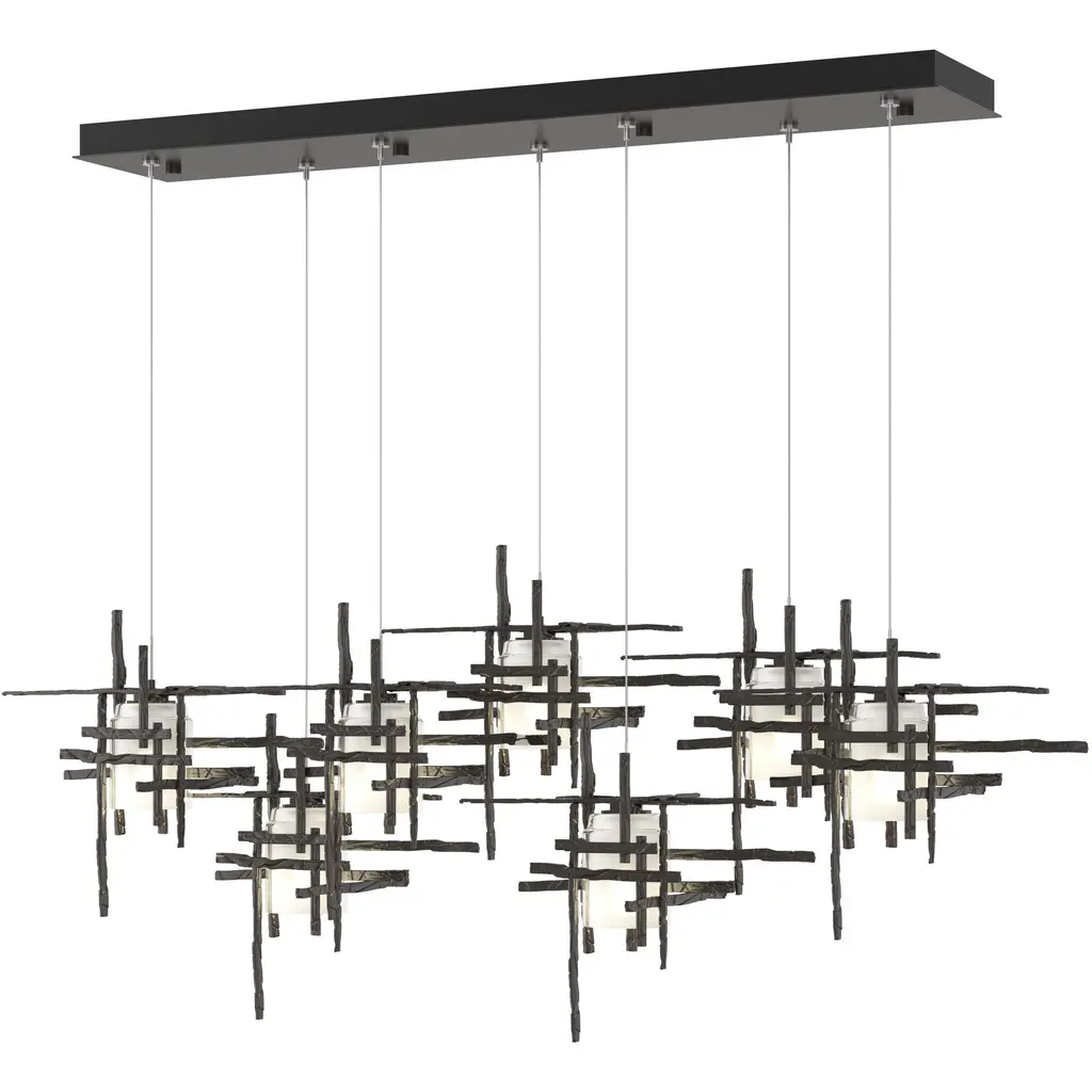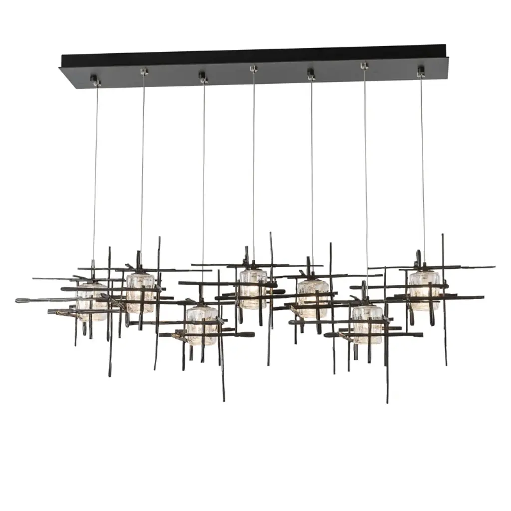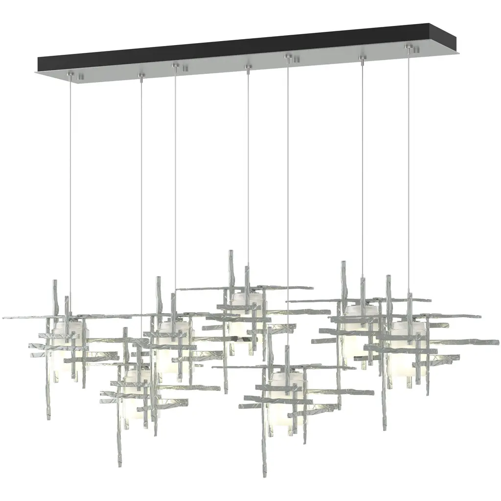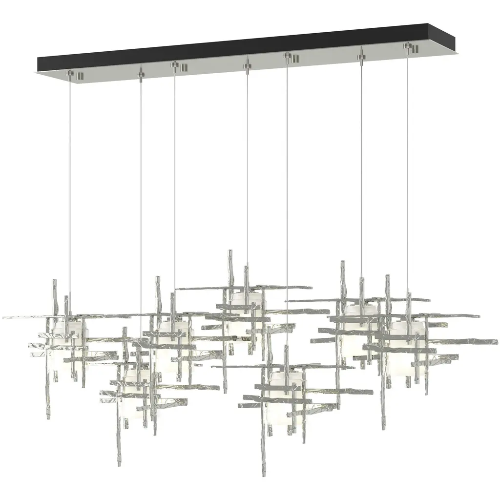 This 7-Light Tura with its rectangular canopy is a linear multi-port pendant, with both depth and dimension. Each intersecting piece is crafted from from annealed aluminum that are hand textured using a trip hammer and custom dies. This Tura Pendant's shades are made of simple, thick cylinders of frosted glass. Available in all standard finishes.