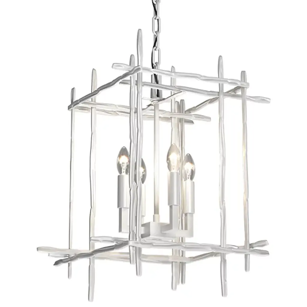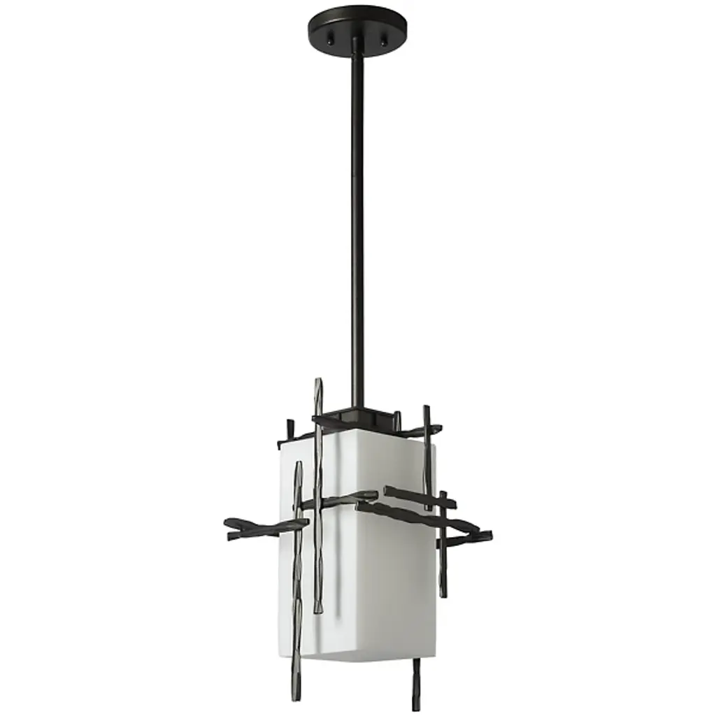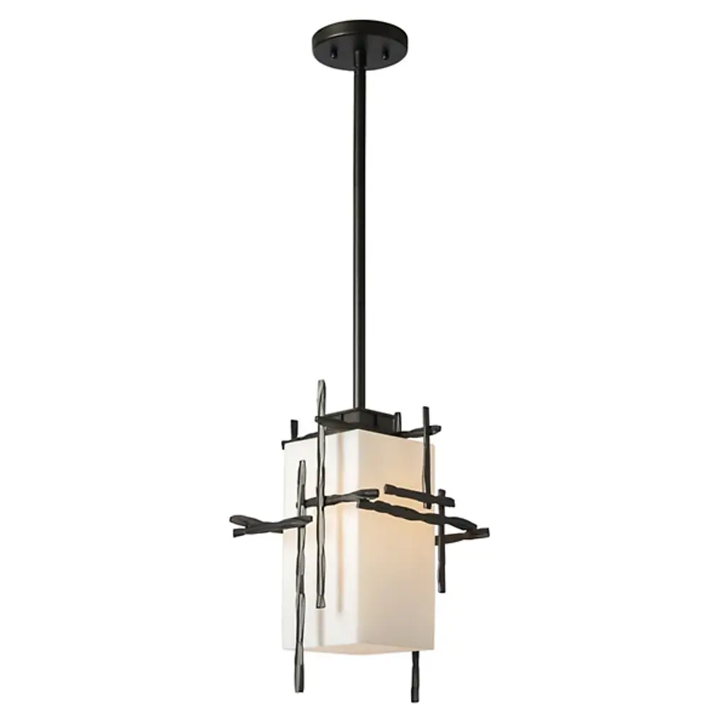 Elegant outdoor lighting with artfully rustic texture. Created by David Kitts, the Tura Outdoor Pendant by Hubbardton Forge features a distinctive cage made of annealed aluminum bars. The bars are hammered by hand using special trip hammers and custom dies to achieve a one-of-the-kind, twig-like texture. The bars are then welded into a cage-like structure that fits around the rectangular glass shade. When illuminated, the craftsmanship of this pendant really shines in a tall entryway or porch.