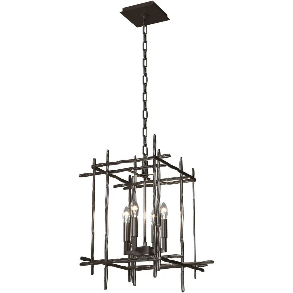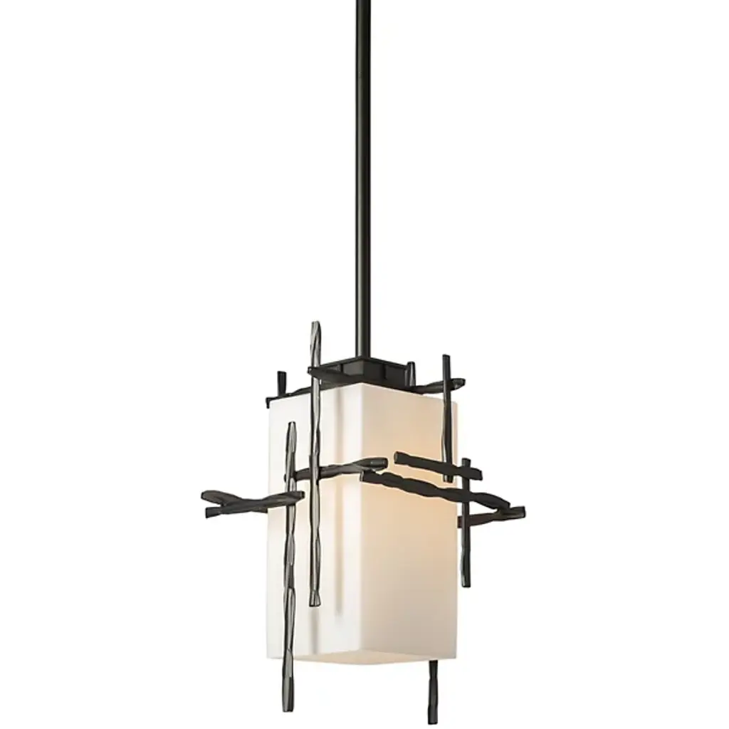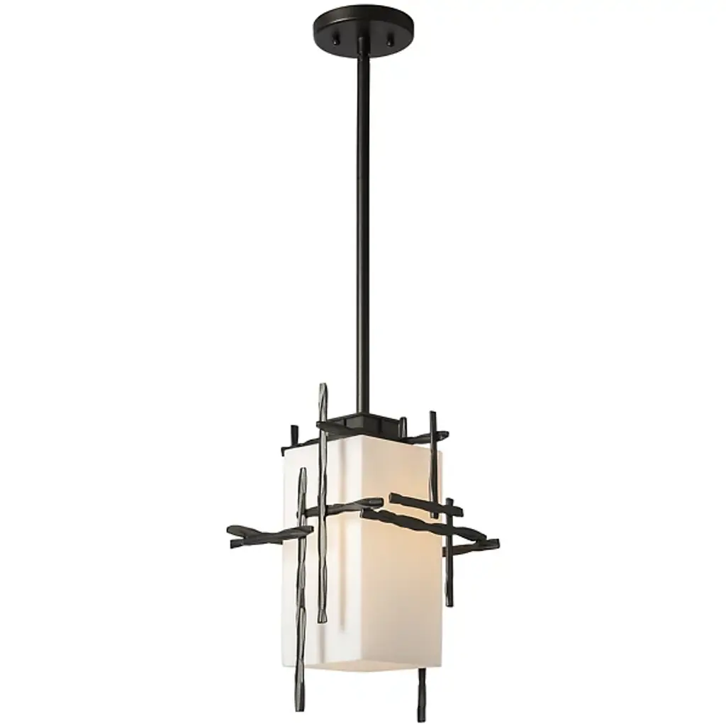 Elegant outdoor lighting with artfully rustic texture. Created by David Kitts, the Tura Outdoor Pendant by Hubbardton Forge features a distinctive cage made of annealed aluminum bars. The bars are hammered by hand using special trip hammers and custom dies to achieve a one-of-the-kind, twig-like texture. The bars are then welded into a cage-like structure that fits around the rectangular glass shade. When illuminated, the craftsmanship of this pendant really shines in a tall entryway or porch.