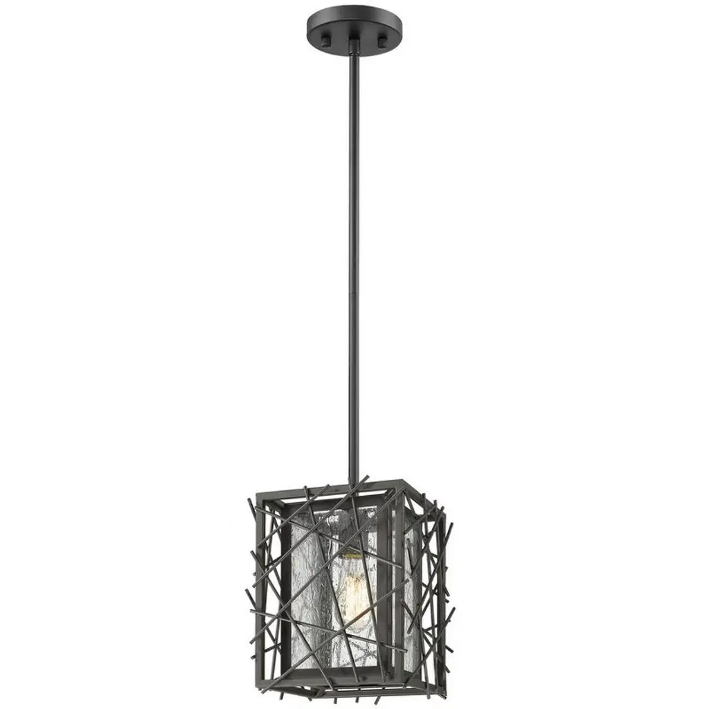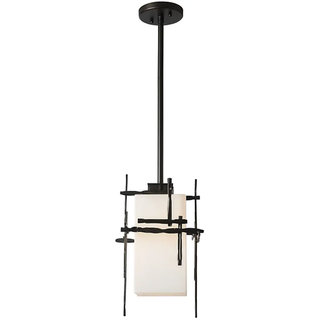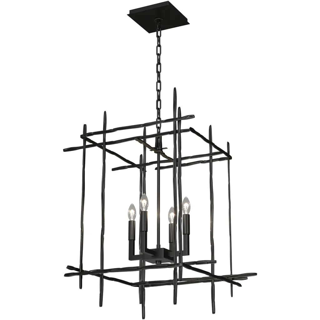 Elegant outdoor lighting with artfully rustic texture. Created by David Kitts, the Tura Outdoor Pendant by Hubbardton Forge features a distinctive cage made of annealed aluminum bars. The bars are hammered by hand using special trip hammers and custom dies to achieve a one-of-the-kind, twig-like texture. The bars are then welded into a cage-like structure that fits around the rectangular glass shade. When illuminated, the craftsmanship of this pendant really shines in a tall entryway or porch.