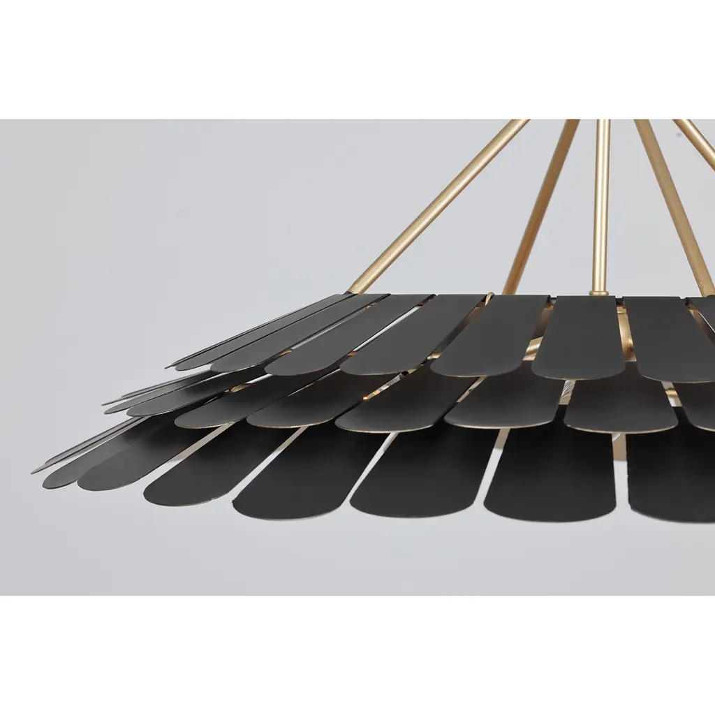 The Savoy House Turaco 6-light chandelier was designed by Breegan Jane, an award-winning interior designer and TV host. Its subtle yet stunning structure is decorated with three rows of petals that are finished in Midnight on the outside and Calypso Gold on the inside, creating classic two-tone allure. Both finishes are hand-applied. This eye-catching look is certain to bring the drama without overwhelming the room. Turaco is 13" in height and 30" in width. Comes with four 12" downrods and one 6" downrod. Uses six candelabra size bulbs of up to 60 watts per bulb. Bulbs not included.