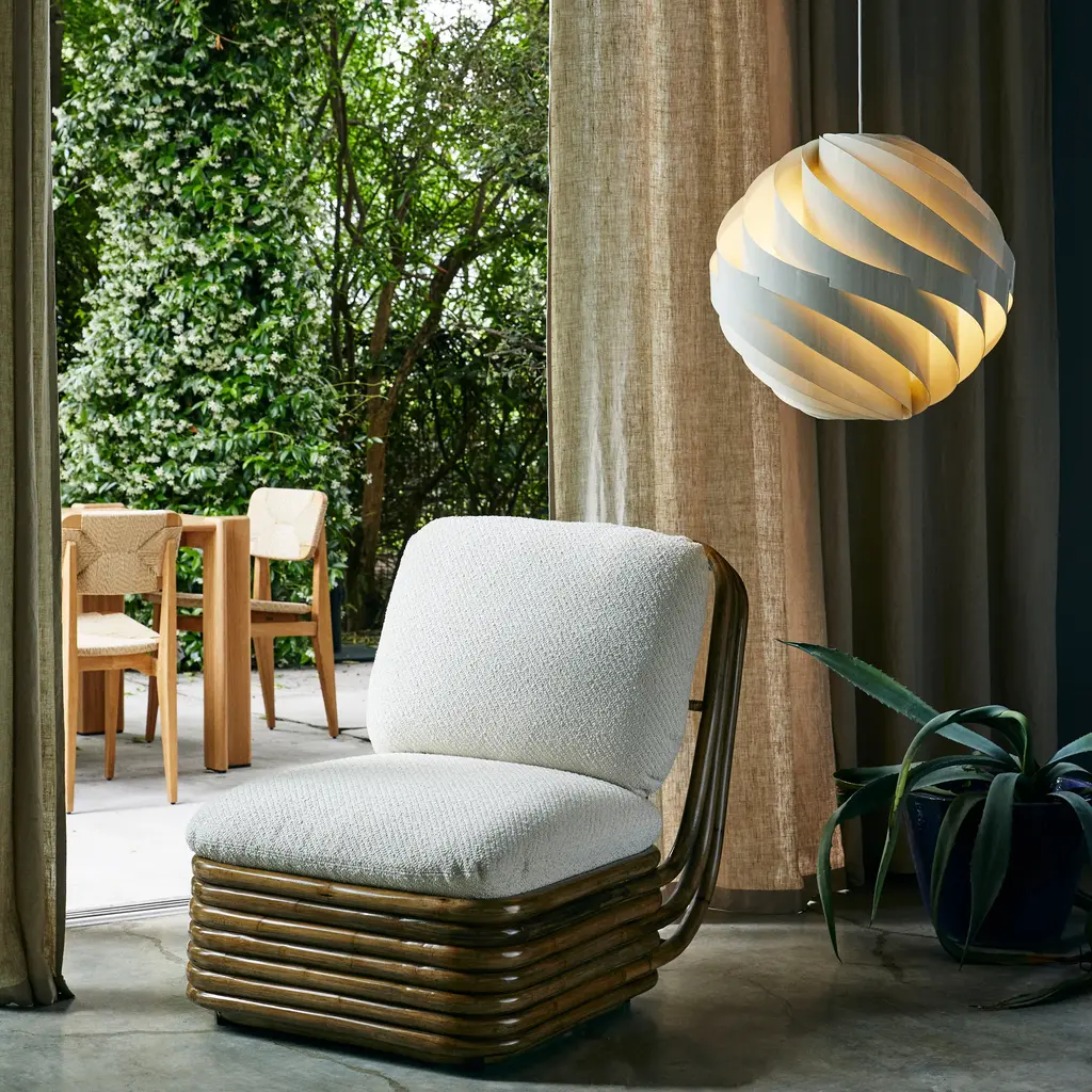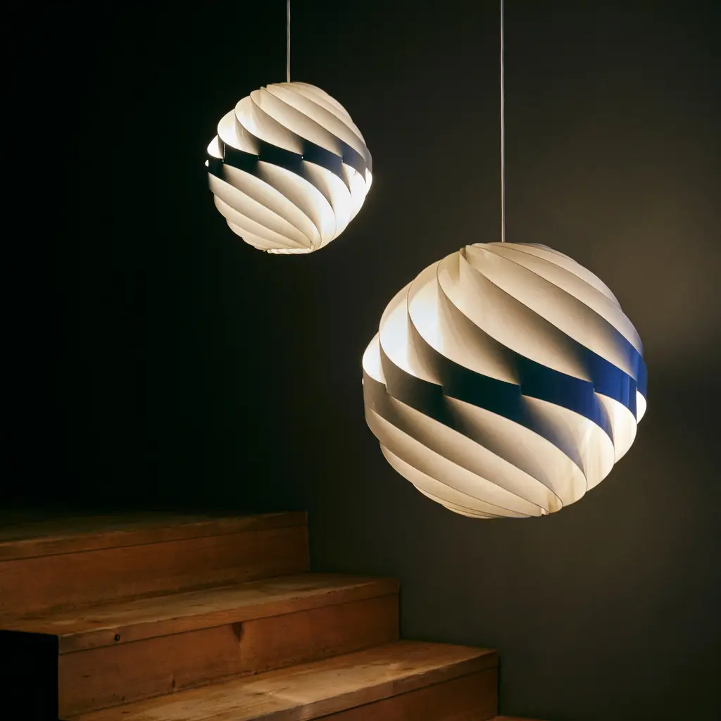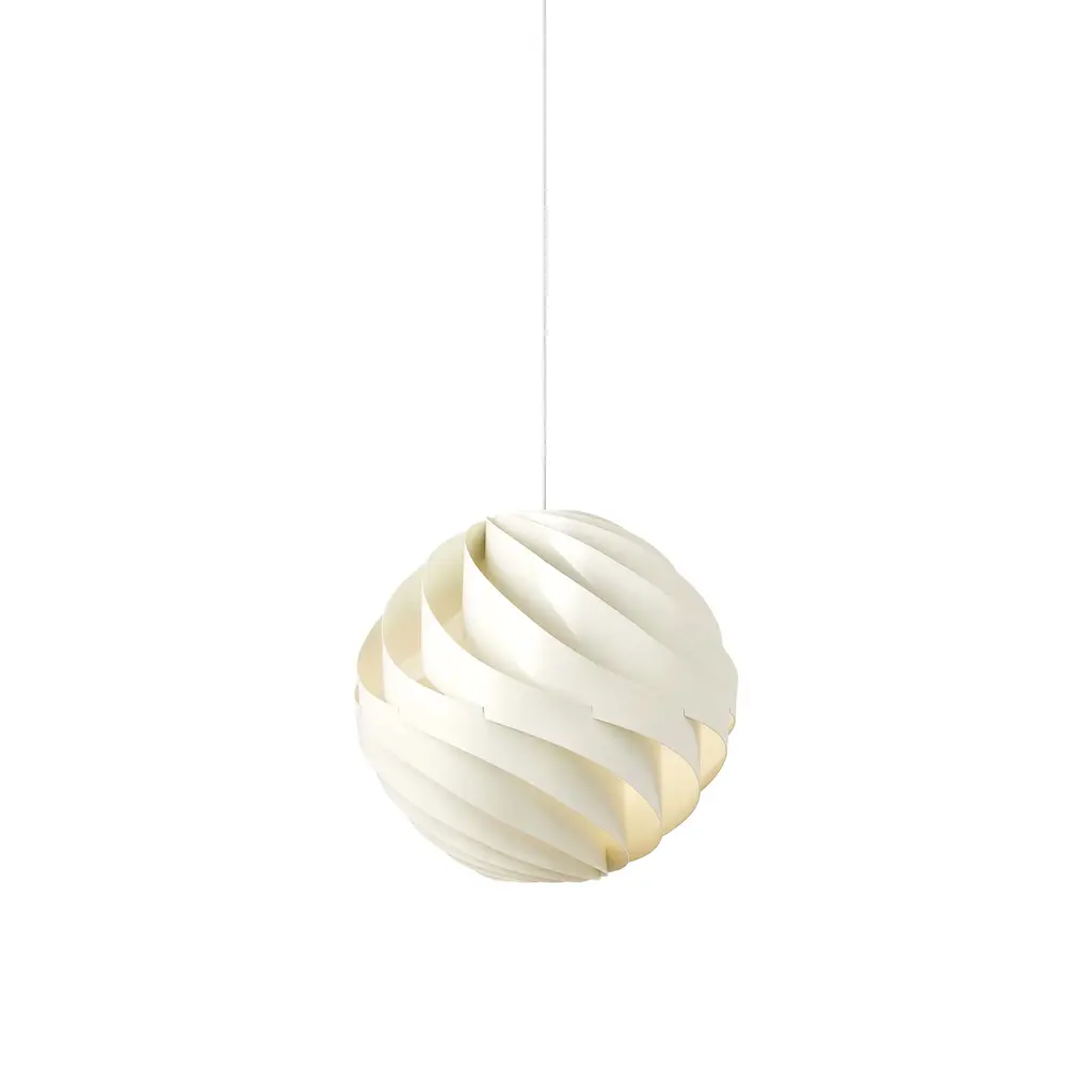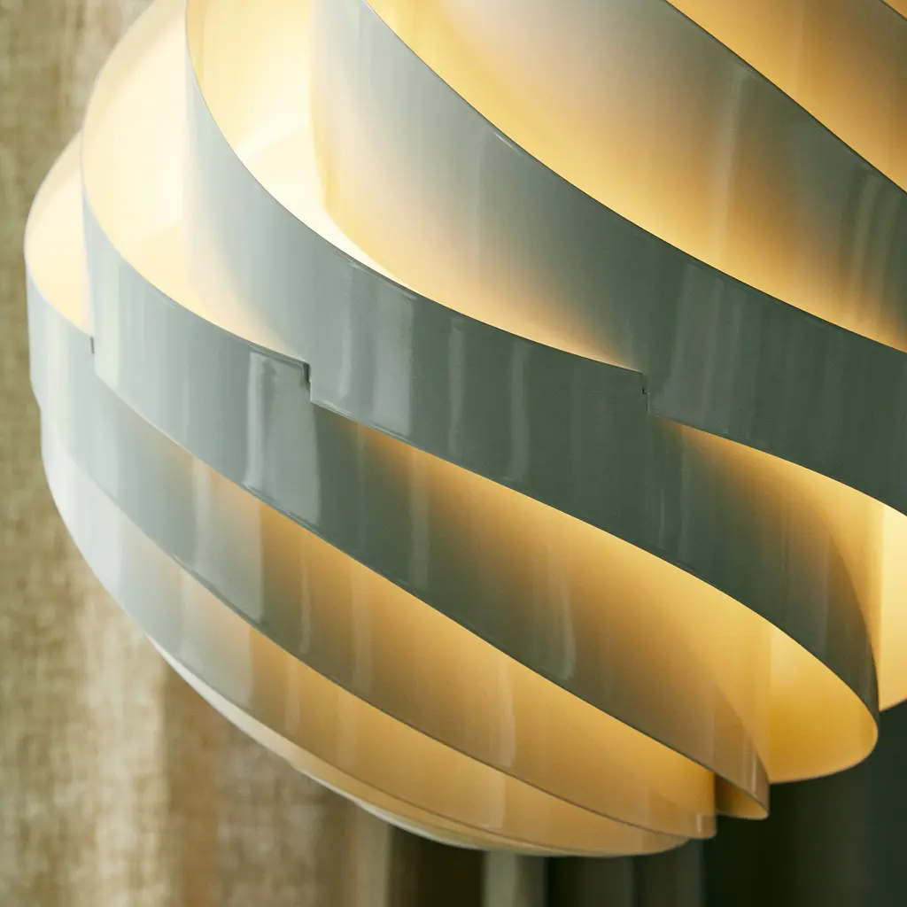 Japanese rice paper lanterns were the inspiration behind Louis Weisdorf's renowned 1965 pendant made of a dozen spiraling slats that form a flower-like globe to shield the light source. Weisdorf's passion for multiple repeating elements gives his simple sphere a complex structure that lends an airy sculptural quality. Fashioned in powder-coated aluminum in crisp matte white, and available in 2 sizes with both a matching canopy and a ceiling-hook mount included.