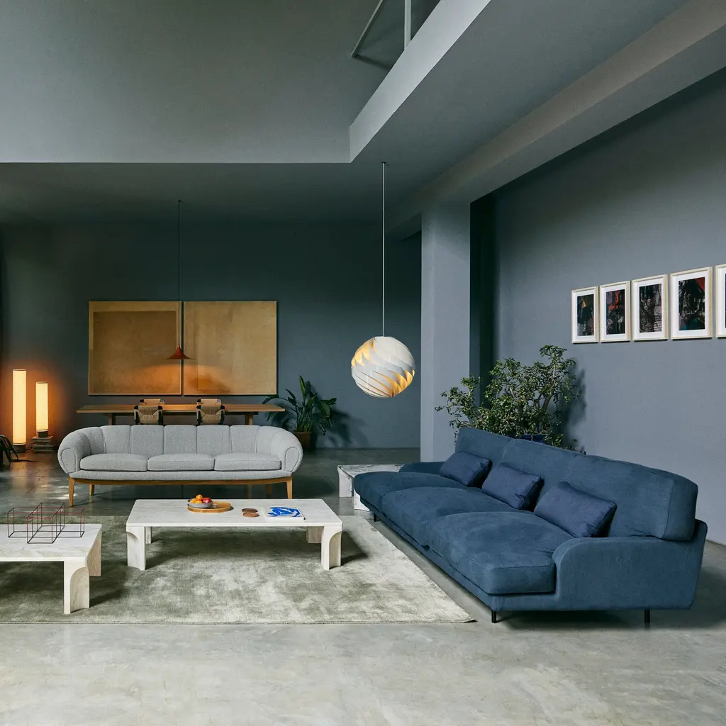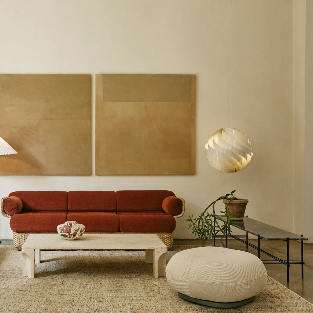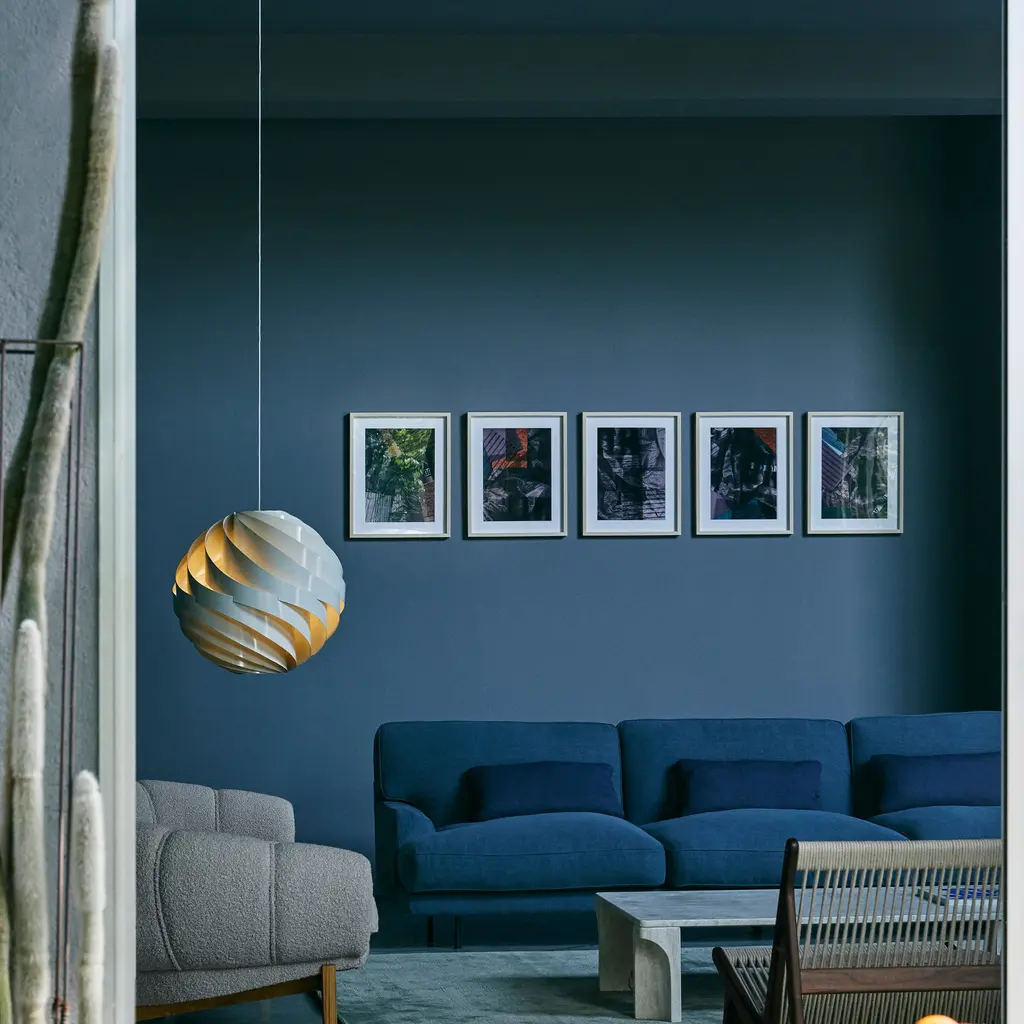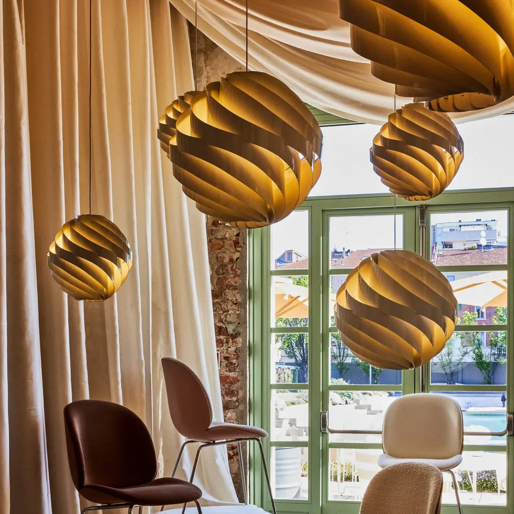 Japanese rice paper lanterns were the inspiration behind Louis Weisdorf's renowned 1965 pendant made of a dozen spiraling slats that form a flower-like globe to shield the light source. Weisdorf's passion for multiple repeating elements gives his simple sphere a complex structure that lends an airy sculptural quality. Fashioned in powder-coated aluminum in crisp matte white, and available in 2 sizes with both a matching canopy and a ceiling-hook mount included.