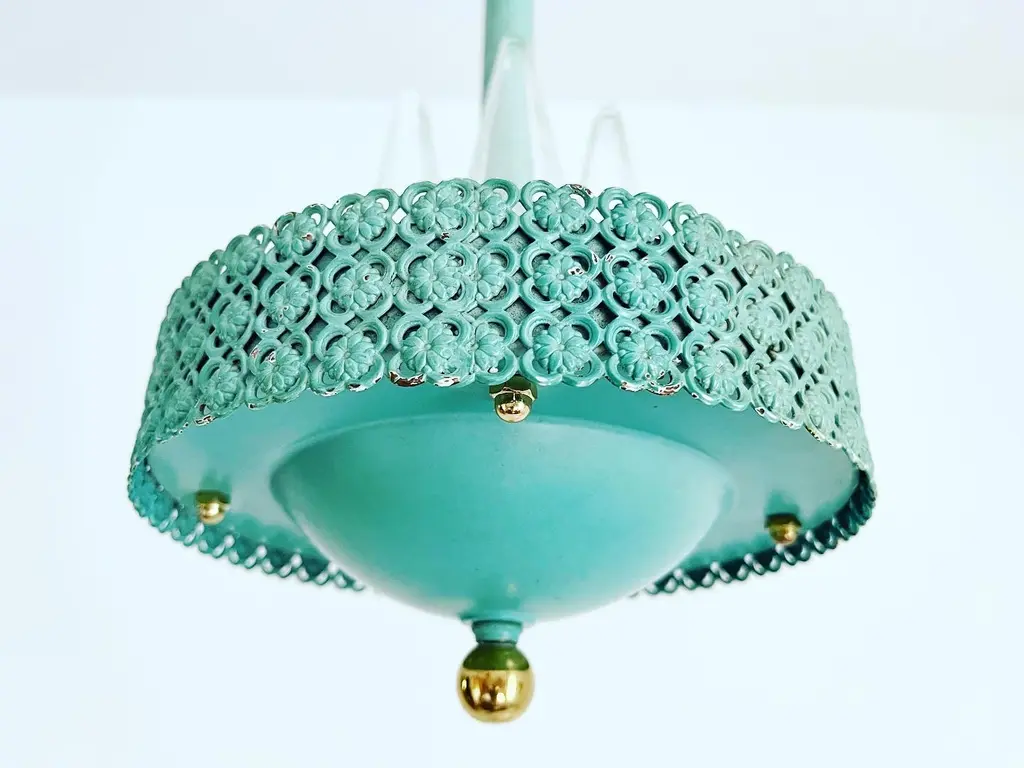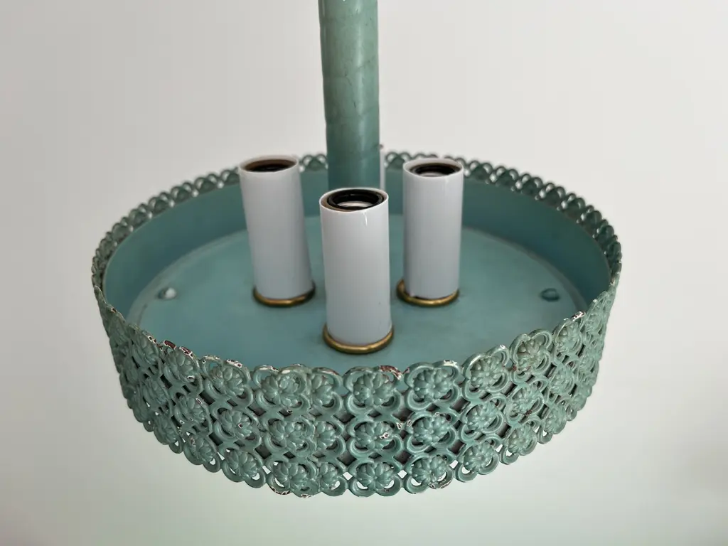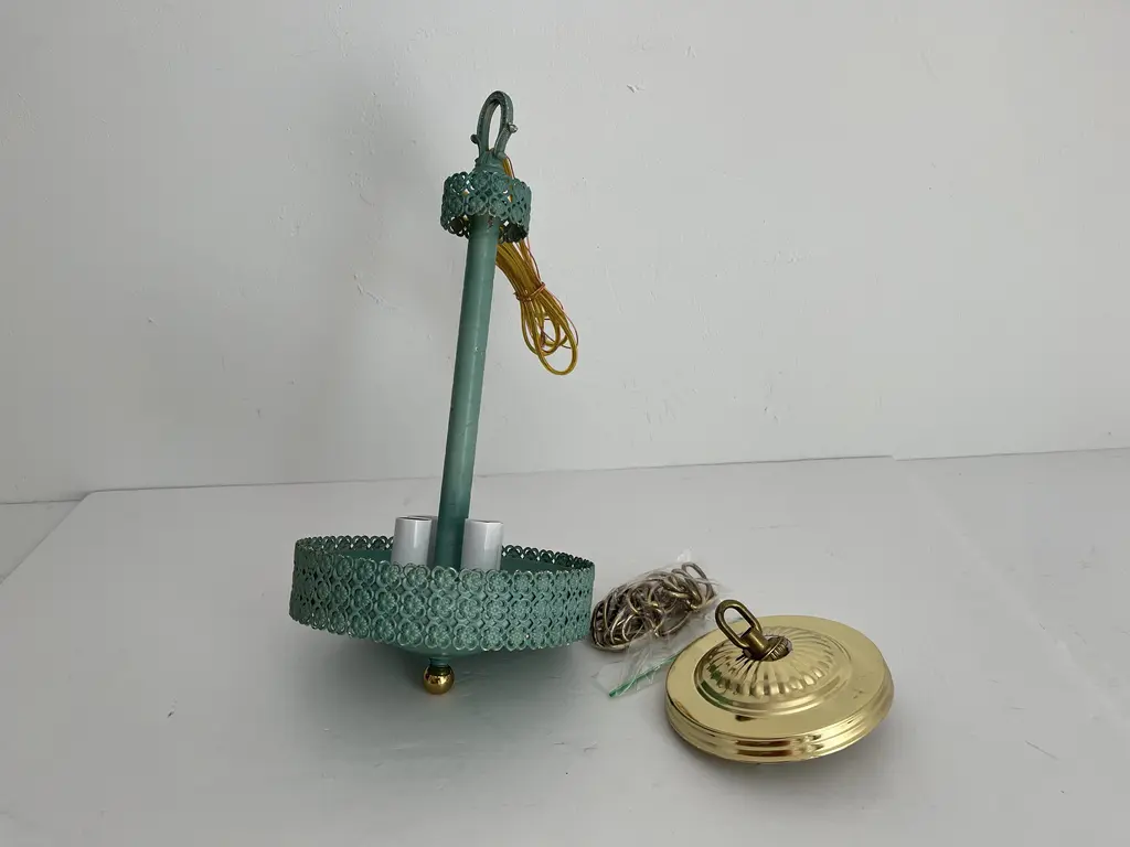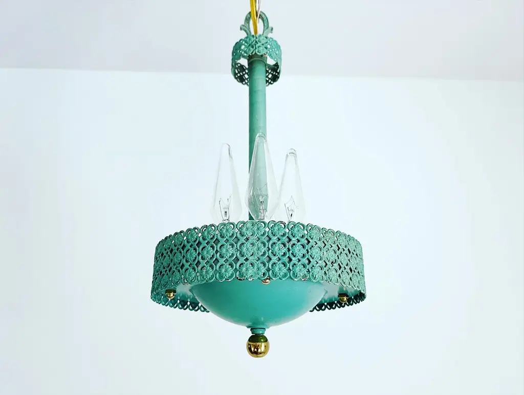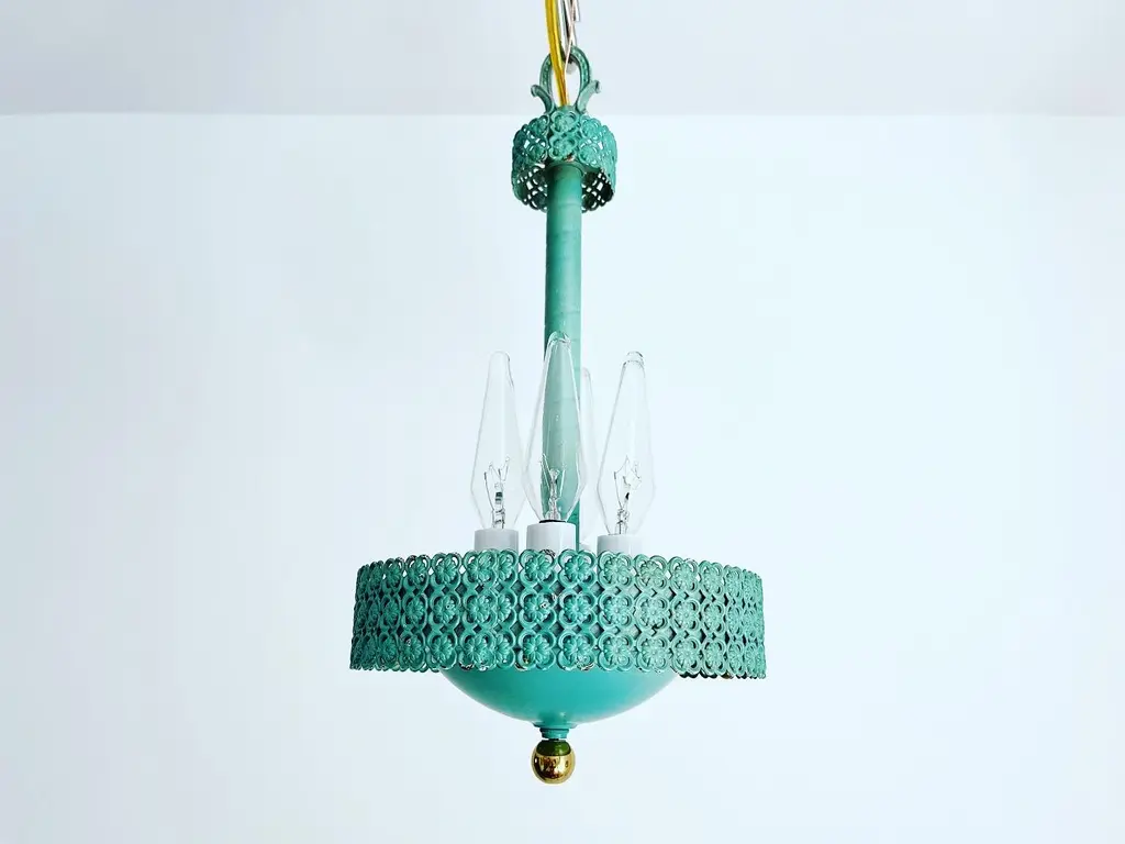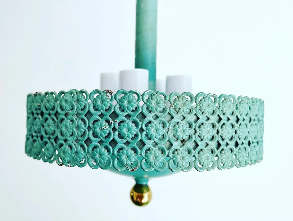 Petite 1950s garden style pendant light featuring a turquoise blue metal frame with rope style neck, filigreed bands of flowers in quatrefoils and round basin with four lights. Newly wired with new sockets and candle sleeves for candelabra bulbs. Comes ready to install with a 34"L adjustable chain and ceiling canopy. Patina, finish wear.