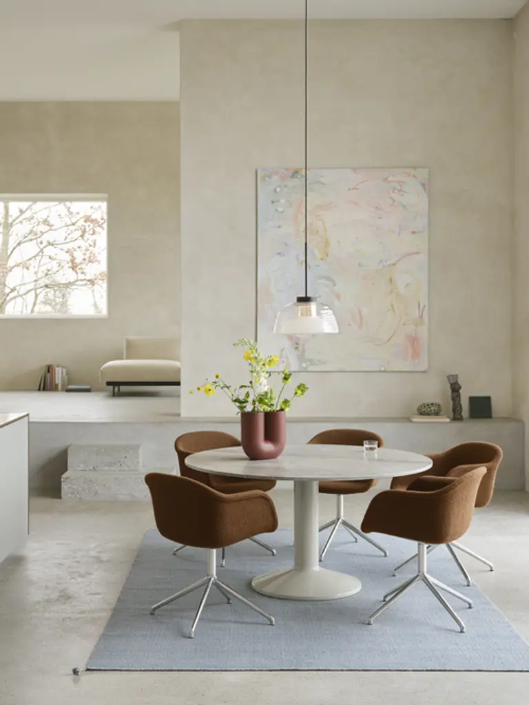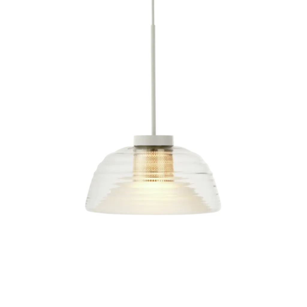 The Two-Layer Pendant brings new perspectives to the classic glass pendant with its rippled, mouth-blown glass, creating unique optical effects from different angles. This refined design combines clear and frosted glass with a punched steel mesh, providing ample, glare-free light. The blend of glossy and matte finishes creates a harmonious, sculptural form that acts as a self-illuminating sculpture. Perfect for dining settings or above counters, it adds visual intrigue and elegance to any space.