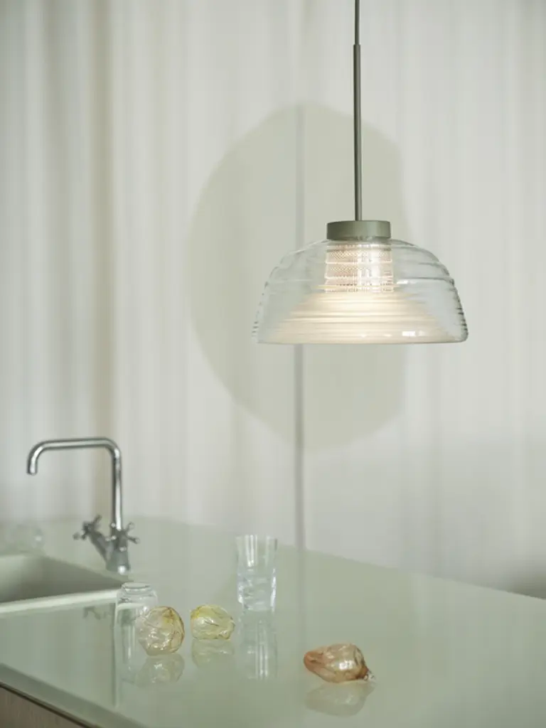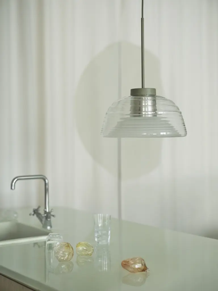 The Two-Layer Pendant brings new perspectives to the classic glass pendant with its rippled, mouth-blown glass, creating unique optical effects from different angles. This refined design combines clear and frosted glass with a punched steel mesh, providing ample, glare-free light. The blend of glossy and matte finishes creates a harmonious, sculptural form that acts as a self-illuminating sculpture. Perfect for dining settings or above counters, it adds visual intrigue and elegance to any space.