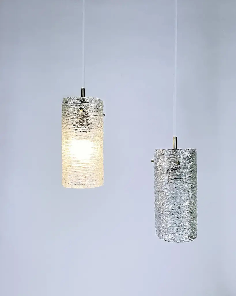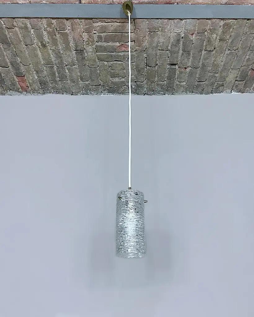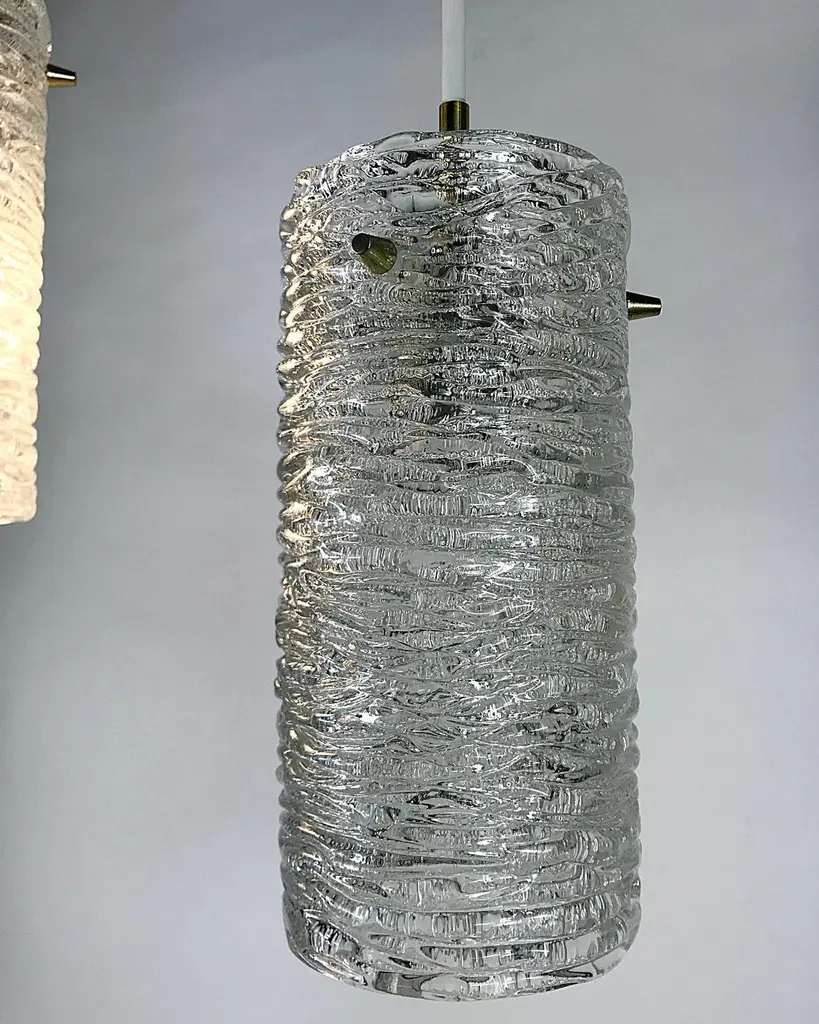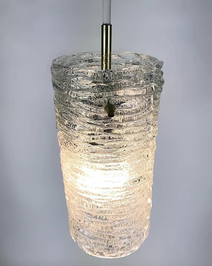 Beautiful high quality midcentury pendant lamp by J.T. Kalmar from 1960s, Vienna. This lamp is a striking appearance in any room. Due to the sublime combination of hand blown textured ice glass with brass details, this lamp is a perfect representation of the late 1950s, early 1960s period. So rightly an icon in the world of designer lighting.Fully working, newly rewired and tested condition, one E27 Edison socket, the lamp works on 220V and 110V. The height is adjustable. Tube height 23.5 cm // 9.3 in.