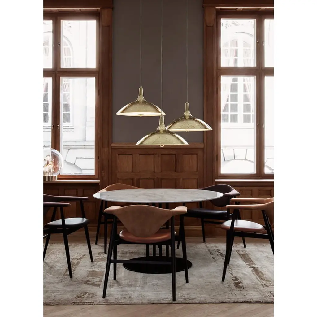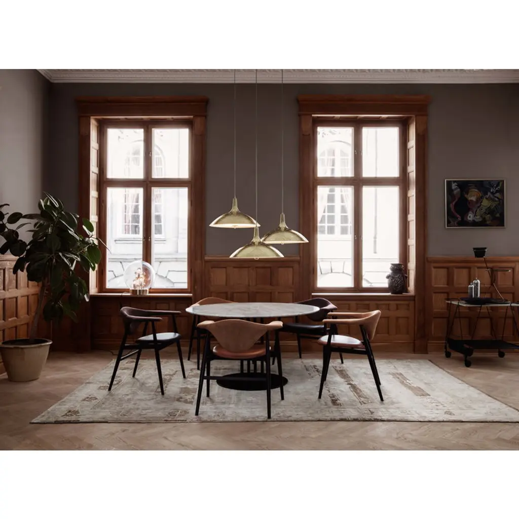 GUBI’s 1965 pendant light was designed by Paavo Tynell in 1948 for New York’s Finland House, an ambitious project showcasing Finnish design in America. Typical of Tynell, the softly curved brass shade of the pendant is decorated with a triangular perforation pattern, giving the surface a vivid sparkle. Due to the frosted glass diffuser, Tynell 1965 emits a soft, glare-free light. Originally manufactured by the Finnish company Oy Taito Ab, the luminaire is part of the Paavo Tynell collection released in 2018 by the Danish design brand GUBI.