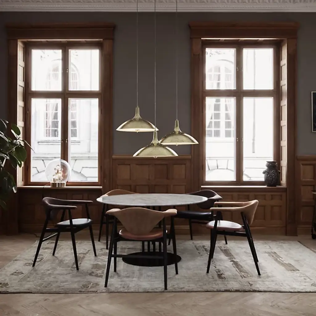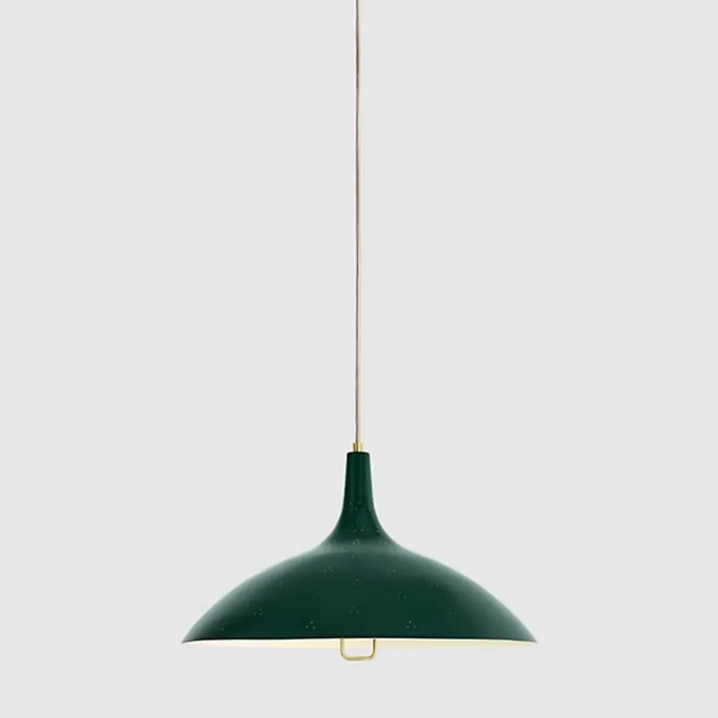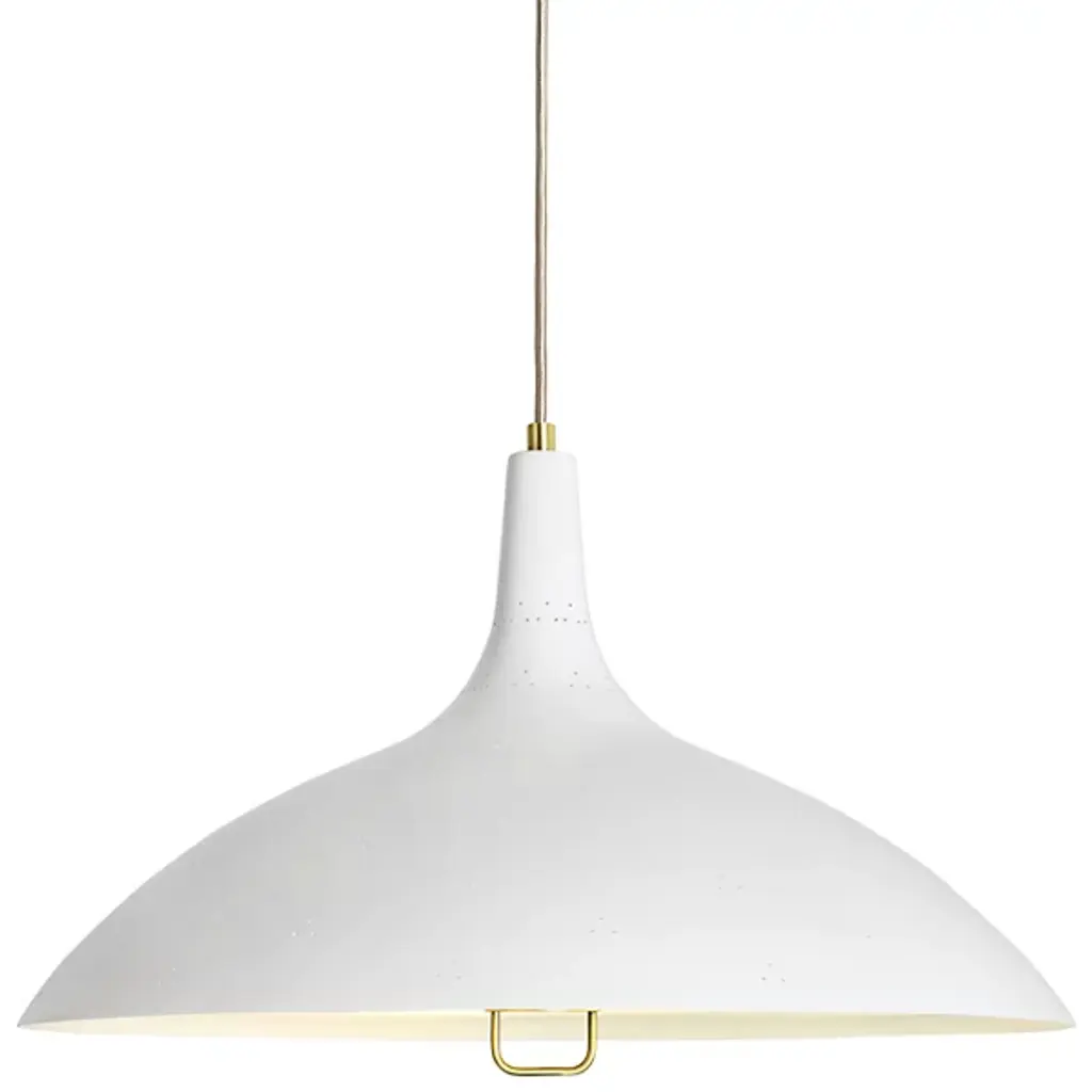 Bring an elegant addition to your indoor living spaces with the spare lines and refined design of the Tynell 1965 Pendant from GUBI. Created in 1947 by Finnish master craftsman Paavo Tynell and showcased at the famous Finland House in New York, it’s emblematic of his simple, modern style, further highlighted by the triangular perforation pattern around the matte-surfaced conical shade. This shade is held at the bottom of a long, slender cable, flaring out to envelop the lamping from the sides, while a frosted glass diffuser below the lamping lends a more serene character to its surroundings.
