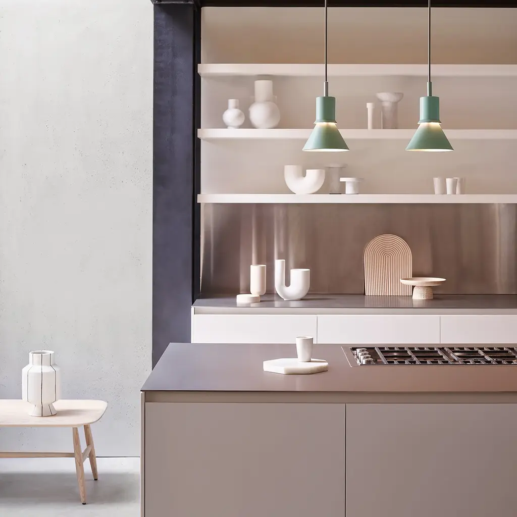 Designer Sir Kenneth Grange gives the iconic Anglepoise shade a new twist with a “halo” of ambient light augmenting the downward illumination of the pendant. Whether deployed individually or in groupings, the fixture is especially useful to brighten a low-light area. Type 80 exudes a modern appeal with curated matte color choices and a clean-lined ceiling plate.