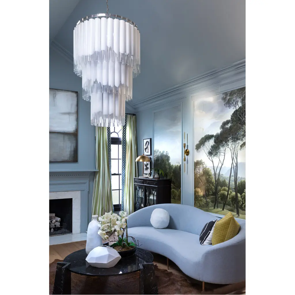 Each glass tube in our Tyrell family is purposely imperfect, frosted opal toward the top before raggedly giving way to perfect clarity by the base. Outer gloss gives them sheen, making for a mysterious and alluring diffusion effect as light comes blushing through from candelabra bulbs set perpendicular to each layer of glass tubes. Tyrell adds a 21st-century touch to a Modernist classic.