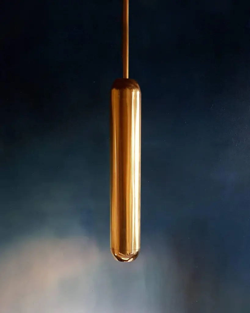 U2 Sculptural Copper Brass Suspension Pendant Lamp by Jan GarncarekDimensions: 56 x 10 x 10 cm (fixture height: made to order)Material: Copper BrassHandcrafted by Jan Garncarek.SignedAlso available in different finishes: - brass (waxed)- nickel coating- copper coating- age brass- black painted- white paintedInformation: weight:6 kg / 13 lbvoltage: 120V, 240Vlamping: 1 x Gu 10, max 60W, 50-60 Hztightness class: IP 21certificates: CE approved, RoHSHeavy vertical form. The lamp is the result of the designer's battlefield fascination from his childhood. The designer came from a family with a military tradition. Bullet shells were the first material Jan Garncarek processed while learning the basics of metallurgy. The designer refers tothe shape of the shell. However, he does not identify it with the cruelty of war. The object captures the fascination of the shape and material, completely out of context of war. Just as only an unaware child is able to perceive reality and its beauty without prejudice.Jan Garncarek is an important contemporary designer, graduated from the Academy of Fine Arts in Warsaw. He gained extra qualifications at Politecnico di Milano. He has acquired professional experience in the design society. He took part in projects such as: design of visual information for the Museum of the history of Polish Jews, interior design project of the Polish cultural Institute in Tel Aviv, space arrangement of the Presidential Palace of Poland, interior design project of the Polish Embassy in Berlin and Skopje, Modernization of the Malachowski's Square in Warsaw. His process of designing is the state of researching, discovering and being curious of the world, making insightful observations and drawing sensible conclusions.All our lamps can be wired according to each country. If sold to the USA it will be wired for the USA for instance.