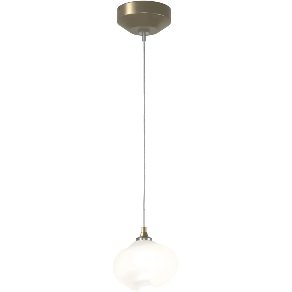 A single glass shade is suspended via adjustable-height low voltage cable from a small round ceiling canopy. The Ume Mini Pendant offers its unique namesake Japanese blossoming plum shaped glass whose inner is frosted and outer is a high-gloss shade.