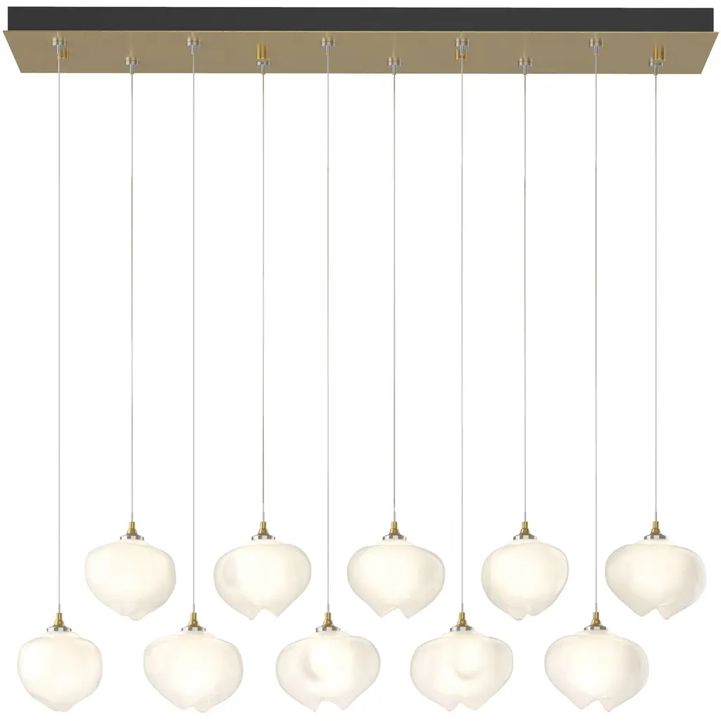 The Ume 10-Light linear fixture offers the exclusive Ume glass shade that is glossy on the outside, yet frosted on the inside, in a shape reminiscent of the Japanese blossoming plum for which it is named. Pendant heights can be easily customized by aligning or staggering each at the desired length from the rectangular canopy above.